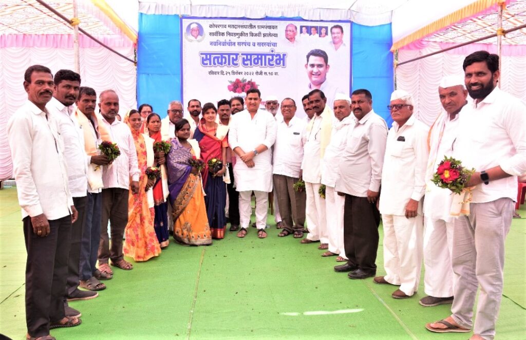 कोपरगाव विधानसभा मतदार संघातील नुकत्याच पार पडलेल्या २६ ग्रामपंचायतीच्या निवडणुकीत निवडून आलेल्या काळे गटाचे १६ नवनिर्वाचित सरपंच व १३० सदस्यांबरोबरच सर्व उमेदवारांचा आ. आशुतोष काळे यांच्या हस्ते सत्कार करण्यात आला याप्रसंगी ते बोलत होते. ते पुढे म्हणाले की, विकास करायचा तर सत्ता हवीच हे आपण मागील तीन वर्षात कोपरगाव मतदार संघात झालेल्या विकासावरून पाहिलं आहे अनुभवलं आहे. मतदार संघाच्या विकासासाठी जास्तीत जास्त निधी कसा मिळविता येईल याचा सातत्याने केलेल्या पाठपुराव्यातून मतदार संघातील पाणी, रस्ते, आरोग्य आदी मुलभूत प्रश्न बऱ्याच अंशी सुटले असून या २७ ग्रामपंचायतीच्या निवडणुकीत तब्बल १६ गावचे सरपंच व १३० सदस्य काळे गटाचे निवडून आले आहेत यावरून झालेला विकास जनतेपर्यंत पोहोचला त्याची हि पावती आहे. मतदार संघाच्या उर्वरित विकासाच्या प्रश्नाचा निपटारा लावण्यासाठी माझा पाठपुरावा सुरूच असून येत्या काही दिवसात ते प्रश्न देखील लवकरच मार्गी लागतील.तुम्हीसुद्धा सर्वाना सोबत घेवून ग्रामविकास मंदिराचे विश्वस्त आहोत ही भावना मनात ठेवून केलेले काम निश्चित प्रभावी आणि लोकाभिमुख ठरेल व गावातील नागरिक नेहमीच तुमच्या सोबत राहतील असा विश्वास उपस्थित नवनिर्वाचित सरपंच, सदस्यांबरोबरच कार्यकर्त्यांना दिला.यावेळी कर्मवीर शंकरराव काळे सहकारी साखर कारखान्याचे व्हा.चेअरमन दिलीपराव बोरनारे, संचालक सुधाकर रोहोम, सूर्यभान कोळपे, सचिन चांदगुडे, श्रीराम राजेभोसले, सुभाष आभाळे, राहुल रोहमारे, प्रवीण शिंदे, शंकरराव चव्हाण, डॉ. मच्छिंद्रनाथ बर्डे, अनिल कदम, सुनील मांजरे, मनोज माळी, शिवाजी घुले, श्रावण आसने, गंगाधर औताडे, महिला संचालक सौ. वत्सलाबाई जाधव, सौ.इंदुबाई शिंदे, माजी जिल्हा परिषद सदस्य सुधाकर दंडवते,माजी सभापती सौ.पौर्णिमा जगधने, शरदचंद्र पवार पतसंस्थेचे चेअरमन राधू कोळपे,जिनिंग प्रेसिंगचे चेअरमन गोरक्षनाथ जामदार, माजी संचालक ज्ञानदेव मांजरे, सचिन रोहमारे,मिननाथ बारगळ, सोमनाथ चांदगुडे, संजय आगवण, राष्ट्रवादीचे युवक अध्यक्ष चारुदत्त सिनगर, राष्ट्रवादीच्या युवती अध्यक्षा सौ.वैशाली आभाळे, सुरेश जाधव, विष्णू शिंदे आदी मान्यवरांसह राष्ट्रवादी काँग्रेस पक्षाचे कार्यकर्ते मोठ्या संख्येने उपस्थित होते.