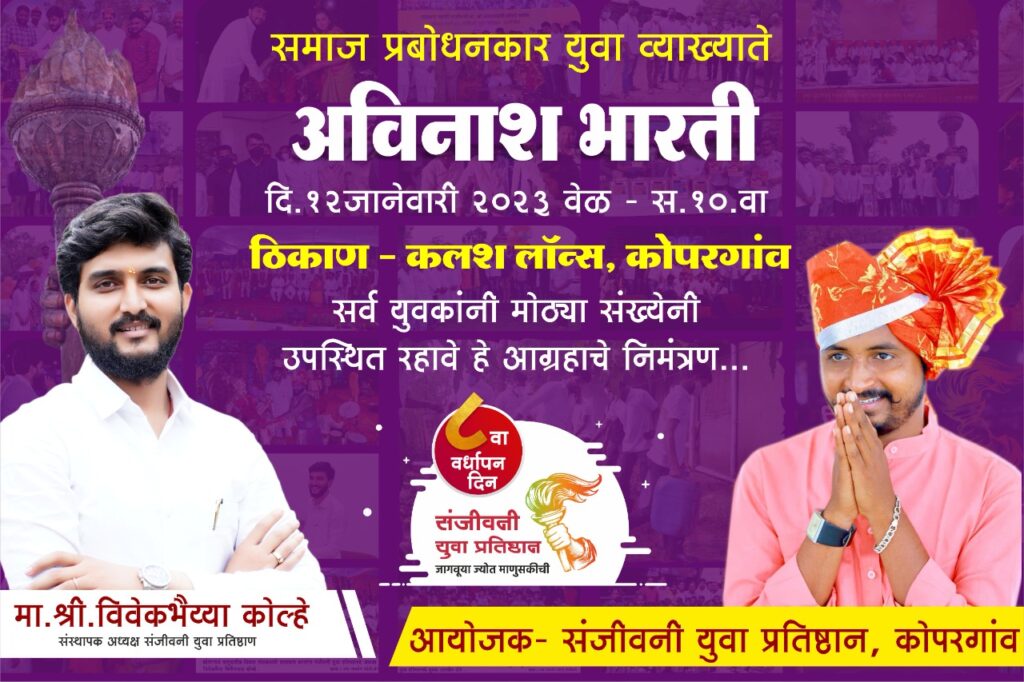 ‘जागवूया ज्योत माणुसकीची’ हे ब्रीदवाक्य घेऊन गेल्या आठ वर्षांपासून अनेकविध सामाजिक उपक्रम राबविणाऱ्या कोपरगाव येथील संजीवनी युवा प्रतिष्ठानचा आठवा वर्धापन दिन १२ जानेवारी २०२३ रोजी साजरा करण्यात येत आहे. यानिमित्त समाजप्रबोधनकार युवा व्याख्याते,प्रसिद्ध कवी अविनाश भारती यांचे प्रेरणादायी व्याख्यान आयोजित करण्यात आले आहे.