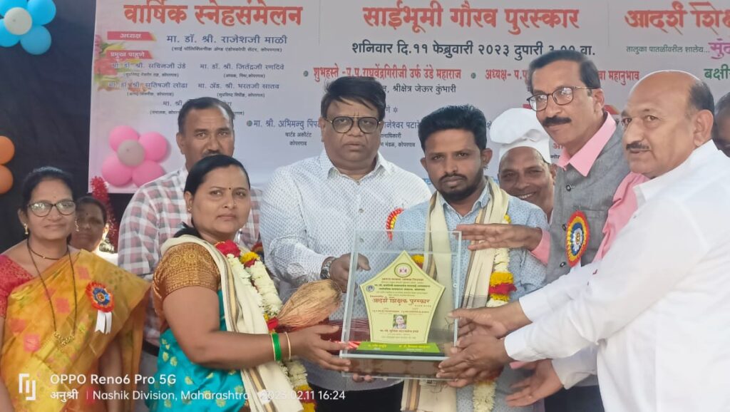 कोपरगाव नगरपालिका शाळा क्र.६ मध्ये उपशिक्षिका पदावर कार्यरत असणाऱ्या उपक्रमशील शिक्षिका सुनिता इंगळे यांना कोपरगाव तालुका विद्यार्थी सहाय्यक समिती संचलित स्व.सौ.कमलिनी बाळासाहेब सातभाई शासनमान्य सार्वजनिक वाचनालय -ग्रंथालय यांच्या वतीने दिला जाणारा प्राथमिक शिक्षण विभागाचा जिल्हास्तरीय आदर्श शिक्षिका पुरस्कार प.पु.पं.महंत राजधरबाबा,डाॕ.राजेश माळी,डाॕ.सचिन उंडे, गटशिक्षणाधिकारी शबाना शेख,डाॕ.रणदिवे,संस्थेचे संस्थापक हिरालाल महानुभव,मठपती मॕडम यांच्या प्रमुख उपस्थितीत देण्यात आला.