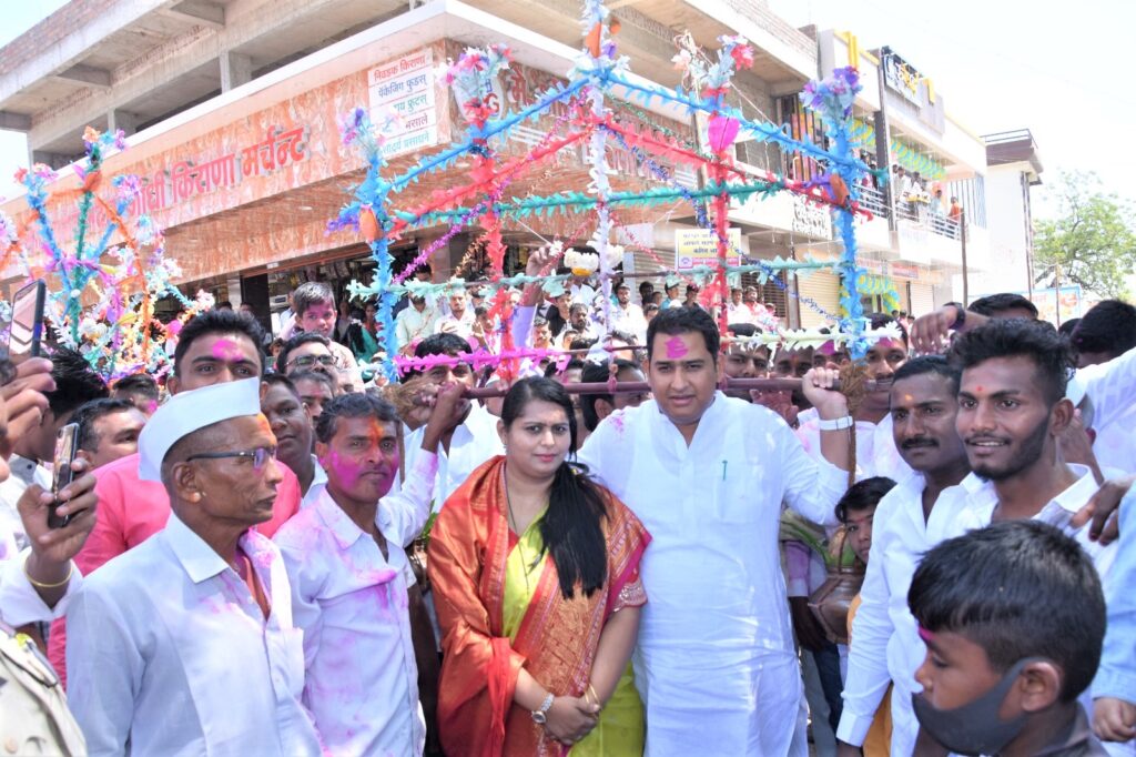 महेश्वर यात्रेनिमित्त काढण्यात आलेल्या कावड यात्रेत आ. आशुतोष काळे खांद्यावर कावड घेवून सहभागी झाले समवेत सौ.चैतालीताई काळे.
