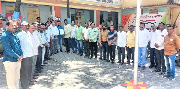 कोपरगाव शहरातील नियोजित कामात बदल करू नये अशा आशयाचे निवेदन उपमुख्याधिकारी ज्ञानेश्वर चाकणे यांना देतांना कोपरगाव शहर राष्ट्रवादी कॉंग्रेसचे पदाधिकारी.