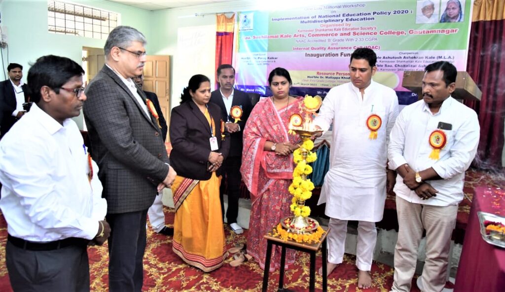 कोपरगाव तालुक्यातील कोळपेवाडी येथील कर्मवीर शंकरराव काळे एज्युकेशन सोसायटीच्या सौ. सुशीलामाई काळे कला, वाणिज्य,व विज्ञान महाविद्यालयातील “२०२० राष्ट्रीय शैक्षणिक धोरणाची अंमलबजावणी-बहुविद्याशाखीय शिक्षण ” या विषयावर राष्ट्रीय कार्यशाळाचे उद्घाटन सावित्रीबाई फुले पुणे विद्यापीठातील वाणिज्य व व्यवस्थापन विभागाचे अधिष्ठाता डॉ. पराग काळकर, कर्नाटक येथील प्राध्यापक डॉ. मल्लाप्पा कोंढणापूर, संस्थेचे विश्वस्त आ.आशुतोष काळे, सचिव सौ. चैतालीताई काळे,गव्हर्निंग कौन्सिल सदस्य, बाळासाहेब बारहाते यांच्या हस्ते पार पडले या प्रसंगी डॉ. पराग काळकर बोलत होते.ते पुढे म्हणाले की, नवीन राष्ट्रीय शैक्षणिक धोरणाची सुरुवात जरी २०२० मध्ये झाली तरी महाराष्ट्रात त्याची अंमलबजावणी २०२३ पासून करण्यात येणार आहे. नवीन शैक्षणिक धोरणाद्वारे होणाऱ्या बदलाची माहिती घेऊन ते सक्षमपणे कसे राबवता येईल यासाठी ग्रामीण भागातील शैक्षणिक संस्थांनी स्थानिक संधी शोधून त्यानुसार कौशल्य आधारित अभ्यासक्रम तयार करावेत. त्यामुळे ग्रामीण भागातील विद्यार्थी ग्रामीण भागातच राहून उपजीविकेचे साधन निर्माण करू शकतो व पदवी मिळविण्यासाठी त्याला कुठेही घरापासून लांब जाण्याची आवश्यकता राहणार नाही. त्यामुळे विद्यार्थ्यांना पदवी बरोबर उपजीविकेचे साधनही निर्माण होईल व विद्यार्थ्यांच्या उच्च शिक्षणातील गळतीचे प्रमाण कमी होईल असा विश्वास व्यक्त केला.