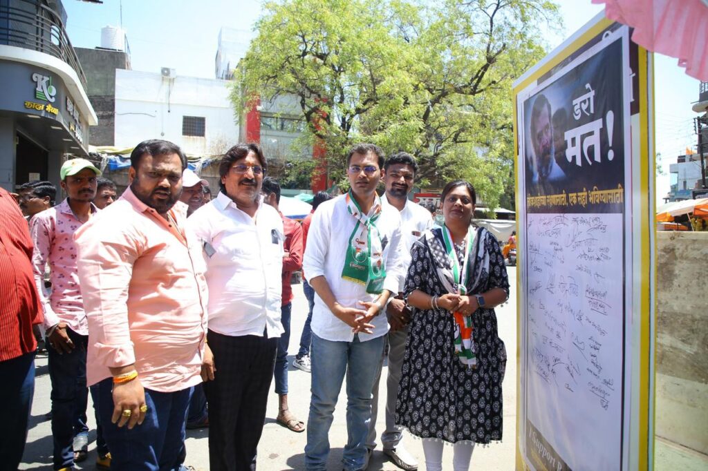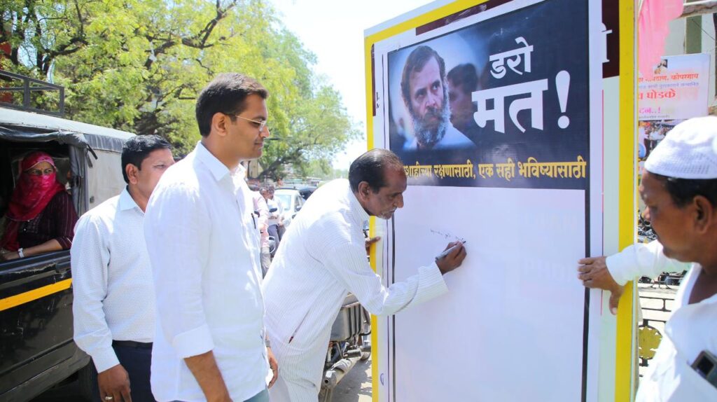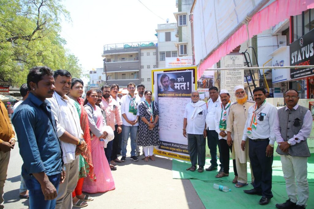 कोपरगांव तालुका काँग्रेस कमिटीच्या वतीने देशाचे नेते राहुलजी गांधी यांची खासदारकी रद्द केल्याच्या कारवाईच्या निषेदार्थ जय भारत सत्याग्रह सभा महात्मा गांधी स्मारक कोपरगाव येथे घेण्यात आली. यावेळी कोपरगाव तालुक्यातील काँग्रेस पक्षाचे कार्यकर्ते आणि महाविकास आघाडीचे पदाधिकारी मोठ्या संख्याने उपस्थित होते.
