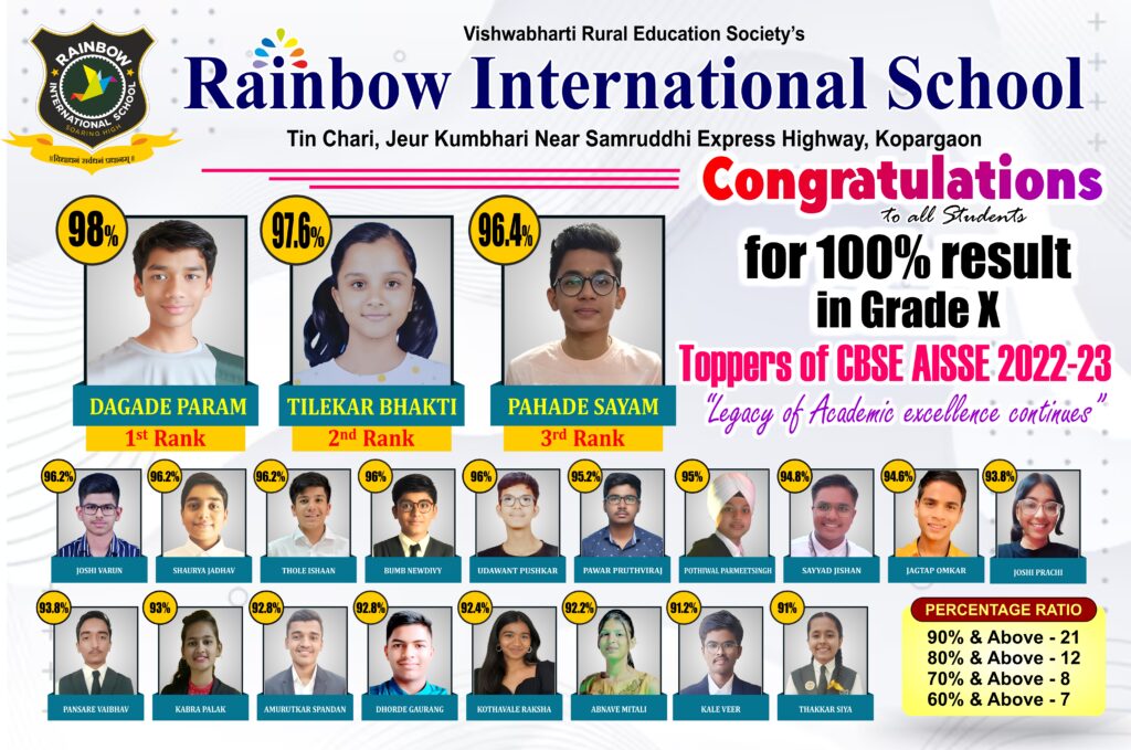 शिक्षण महर्षी लहानुभाऊ नागरे स्थापित रेन्बो इंटरनॅशनल स्कूल मध्ये विद्यार्थ्यांच्या सर्वांगीण विकासासह गुणवत्तापूर्ण उत्कृष्ठ शिक्षणावर भर दिला जातो याचेच प्रतिफल म्हणजे सन २०२२- २३ मध्ये झालेल्या दहावी सी .बी.एस. ई .परीक्षेत विद्यार्थ्यांनी मिळवलेले नेत्रदिपक यश होय . सदर परीक्षेत १००% निकालाची परंपरा कायम ठेवत प्रथम क्रमांक – दगडे परम विनोद ९७.८ %,