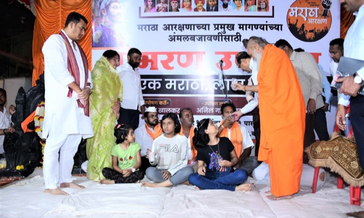 कोपरगाव शहरातील छत्रपती शिवाजी महाराज यांच्या स्मारकाजवळ मागील पाच दिवसांपासून मराठा समाजाला आरक्षण मिळावे यासाठी मागील ५ दिवसांपासून अॅड. योगेश खालकर, अनिल गायकवाड, विनय भगत यांनी आमरण उपोषण सुरु केले होते. या आंदोलनाची दखल घ्यावी याकडे आ. आशुतोष काळे यांनी उपमुख्यमंत्री ना. अजितदादा पवार यांचे देखील लक्ष वेधले होते. उपोषणकर्त्यांची प्रकृती खालावत चालल्यामुळे शुक्रवार (दि.१५) रोजी मराठा समाजाच्या शिष्टमंडळासह जिल्ह्याचे पालकमंत्री तथा महसूलमंत्री ना. राधाकृष्ण विखे पाटील यांची भेट घेऊन या उपोषणाची तातडीने दखल घेण्याची विनंती आ. आशुतोष काळे यांनी केली होती. त्या विनंतीची पालक मंत्र्यांनी दखल घेवून उपोषणस्थळी येवून उपोषणकर्त्या मराठा समाज बांधवांशी सकारात्मक चर्चा केली. मराठा समाजाला टिकणारे आरक्षण मिळावे हि महायुती शासनाची प्रामाणिक इच्छा आहे. यासाठी सर्व बाजूनी कायदेशीर अभ्यास करून मराठा समाजाला आरक्षण मिळवून देण्यासाठी महायुती शासन प्रयत्नशील आहे. त्यामुळे आपण उपोषण मागे घ्यावे अशी पालकमंत्री तथा महसूलमंत्री ना. राधाकृष्ण विखे पाटील यांची विनंती उपोषणकर्त्यांनी मान्य करून प.पु.संत रमेशगिरी महाराज व लहान मुलींच्या हस्ते लिंबू पाणी पिऊन आमरण उपोषण सोडले.