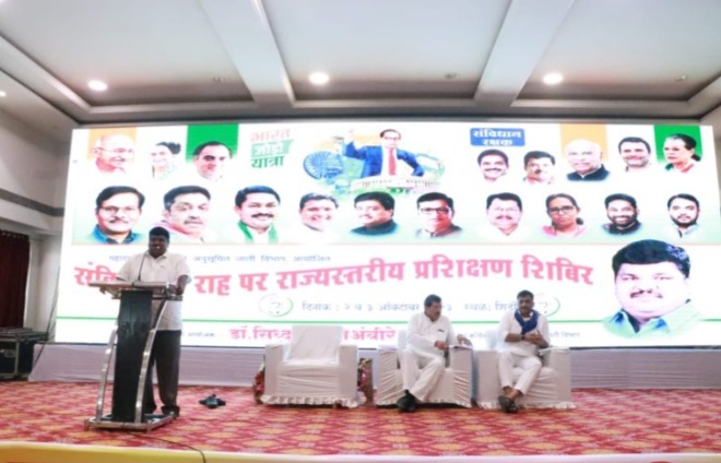 शिर्डी -भाजप सरकार सत्तेत आल्या पासून सतत घटना विरोधी कृत्य करत आहे. भारतीय संविधानाने आपल्याला लोकशाही मूल्य दिलेली असतांना मानवी मूल्य तुडविली जात आहेत, स्वातंत्र्यचा गळा घोटण्याचं काम इथे होतं आहे याचे मोठे उदाहरणं म्हणजे मणिपूरमध्ये चालू असलेला नर संहार. आज मणिपूर वर लोकशाही चे मंदिर असलेल्या पार्लमेंट मध्ये मणिपूर विषयावर बोलू दिलं जात नाही.350 हुन अधिक चर्च मणिपूर जाळलंय तसेच 2-3 मंदिर उध्वस्त केली गेली मात्र, त्यावर अजूनही प्रधानमंत्री मोदी यांनी त्यावर तोडगा काढला नाही. एकप्रकारे हा देश धोक्यात आला आहे असे सांगून मुकुल वासनिक यांनी भारतीय घटना शाबूत ठेवण्या साठी काँग्रेस पक्ष शेवटपर्यंत लढा चालूच ठेवेल संपूर्ण भारतीयांनी काँग्रेस विचार धारा जोपसावी असे आवाहन करत भारतीय घटना तयार करतांना मसुदा समितीच्या झालेल्या सभा, त्यांचे अध्यक्ष व तारखाचा अभ्यासपूर्ण उल्लेख केला. संविधान कि राह पर या राज्यस्तरीय शिबिराचे आयोजन करून आयोजक सिद्धार्थ हत्तीअभीरे यांनी आपल्या नेतृत्वाची चुणूक दाखवली प्रत्येक ठिकाणी असा कार्यकर्ता तयार व्हावा अशीच अपेक्षा खा. वासनिक यांनी व्यक्त केली. कार्यक्रमाच्या सुरुवातीला महापुरुशांच्या प्रतिमांचे पूजन करून झाली.निळा झेंडा आणि जयभीम चा नारा आता काँग्रेसनेही स्वीकारावा