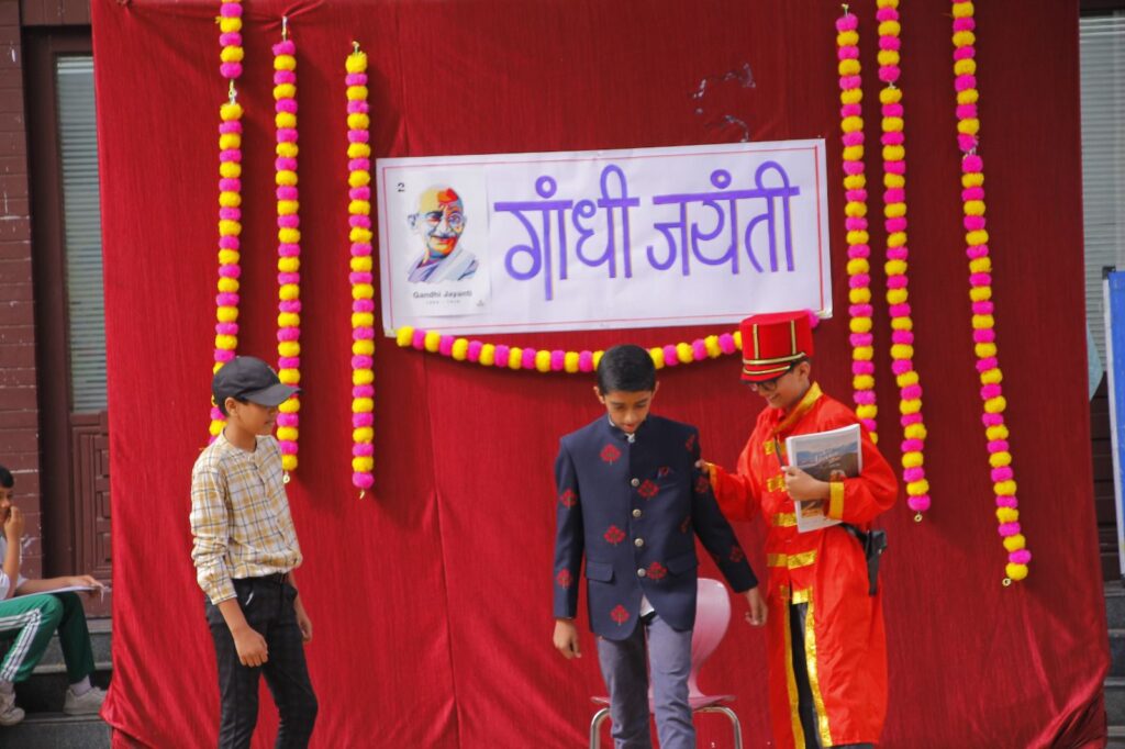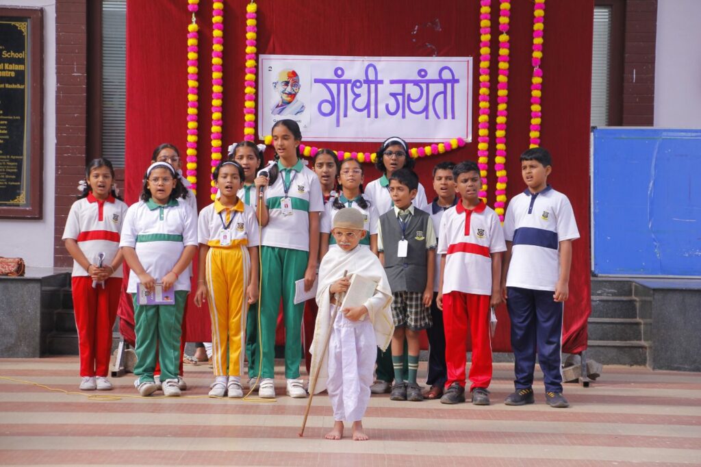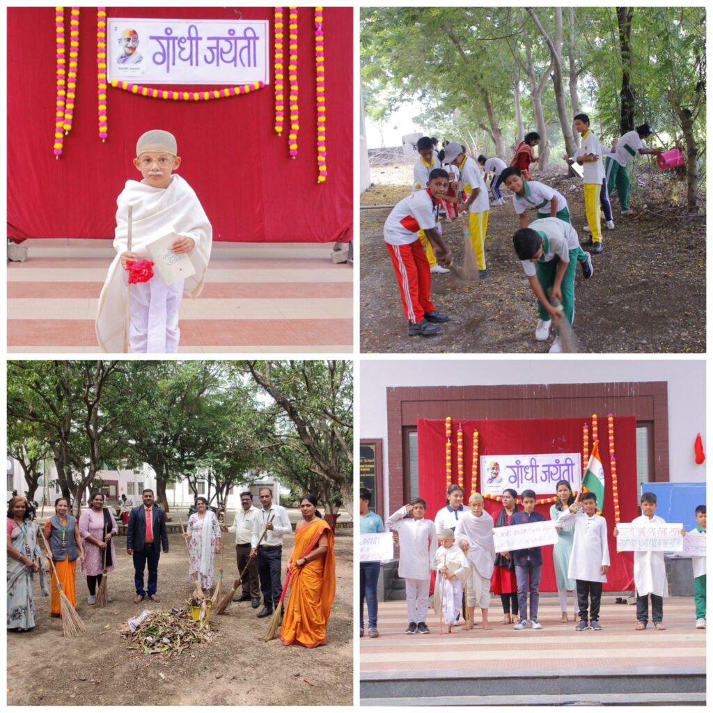 दत्ता डोखे यांनी प्राथमिक विभागातील विद्यार्थ्यांसमवेत “रघुपति राघव राजाराम….” हे भजन गाऊन वातावरण भक्तीमय केले. यानंतर सातवीच्या विद्यार्थ्यांनी “मोहन से महात्मा” ही बापूजींच्या जीवनावर प्रकाश टाकणारी नाटिका सादर केली. यामध्ये दुसरीचा विद्यार्थी प्रणील कातकडे याने साकारलेल्या महात्मा गांधींच्या भूमिकेने सर्वांचे लक्ष वेधले. परवीन कुरेशी, प्रीती शेखो, संकेत गोडगे ह्या शिक्षकांसह स्वरा रोहमारे विद्यार्थिनीने या नाटिकीचे दिग्दर्शन केले होते. कार्यक्रमानंतर ५०० पेक्षा अधिक विद्यार्थी, कर्मचारी व शिक्षकांनी शाळेचा परिसर साफ करुन बापूंना ‘स्वच्छांजली’ अर्पण केली आणि स्वच्छ भारत अभियान मध्ये सहभागी झाले.