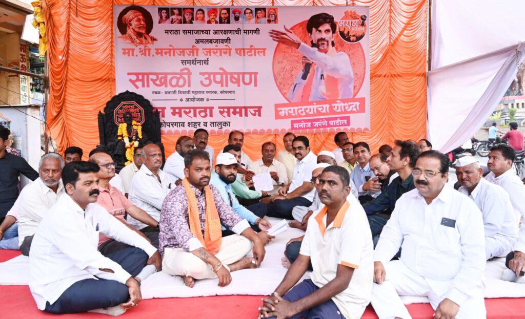 मराठा आरक्षणाच्या मागणीसाठी अंतरवाली सराटी येथे आमरण उपोषणाला बसलेले मनोज जरांगे पाटील यांच्या उपोषणाचा आजचा सातवा दिवस आहे. त्यांच्या समर्थनार्थ कोपरगाव शहर व तालुका सकल मराठा समाजाच्या वतीने कोपरगाव शहरात छत्रपती शिवाजी महाराज स्मारकाजवळ साखळी उपोषण सुरू आहे. माजी आमदार स्नेहलताताई कोल्हे यांची प्रकृती सध्या ठीक नसल्याने त्यांनी आज मंगळवारी (३१ ऑक्टोबर) भ्रमणध्वनीवरून या उपोषणकर्त्यांशी संपर्क साधून उपोषणाला पाठिंबा जाहीर केला. संजीवनी उद्योग समुहाचे अध्यक्ष बिपीनदादा कोल्हे यांनी मंगळवारी सायंकाळी उपोषणस्थळी भेट देऊन उपोषणकर्त्यांना पाठिंबा दिला. त्यांनी उपोषणकर्ते विनय भगत, अनिल गायकवाड, बाळासाहेब जाधव, अमित आढाव, सुनील साळुंके यांच्याशी चर्चा केली. यावेळी सहकारमहर्षी शंकरराव कोल्हे सहकारी साखर कारखान्याचे माजी संचालक बाळासाहेब नरोडे, माजी नगराध्यक्ष राजेंद्र शिंदे, दिलीपशेठ दारुणकर, राजेंद्र सोनवणे, भाजपचे शहराध्यक्ष डी. आर. काले, माजी नगरसेवक बबलूशेठ वाणी, संजय जगदाळे, नसीरभाई सय्यद, विवेक सोनवणे, अबुजरभाई शेख, रवींद्र रोहमारे, संतोष साबळे, प्रा. दत्तात्रय गाढे, प्रा. बाळासाहेब वडांगळे, प्रा. गिरमकर, मुन्ना दरपेल, रोहन दरपेल, राजेंद्र डागा, साई नरोडे, दीपक पंजाबी, रुपेश सिनगर आदींसह मराठा समाजबांधव, भाजपचे पदाधिकारी, कार्यकर्ते मोठ्या संख्येने उपस्थित होते.