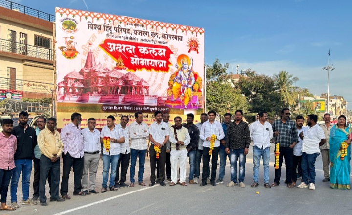 श्री क्षेत्र अयोध्या येथे २२ जानेवारी रोजी भव्य मंदिरात श्रीरामलल्लाच्या शिल्पाची स्थापना होणार असून या भव्यदिव्य सोहळ्याच्या निमित्ताने अयोध्या येथून श्रीराम जन्मभूमी न्यासातर्फे संपूर्ण देशात अभिमंत्रित केलेला ‘अक्षदा कलश’ पाठविण्यात आला असून या ‘अक्षदा कलशाचे’ कोपरगाव शहरात आगमन होताच आ. आशुतोष काळे यांच्या वतीने राष्ट्रवादी काँग्रेस पक्षाच्या कार्यकर्त्यांनी जय श्रीरामाचा जयघोष करत ‘अक्षदा कलशाचे’विधिवत पूजन करून मनोभावे दर्शन घेतले. या ‘अक्षदा कलशाचे’ दर्शन घेण्यासाठी कोपरगाव शहरातील चौकाचौकात नागरिकांनी मोठी गर्दी केली होती.