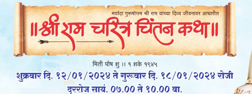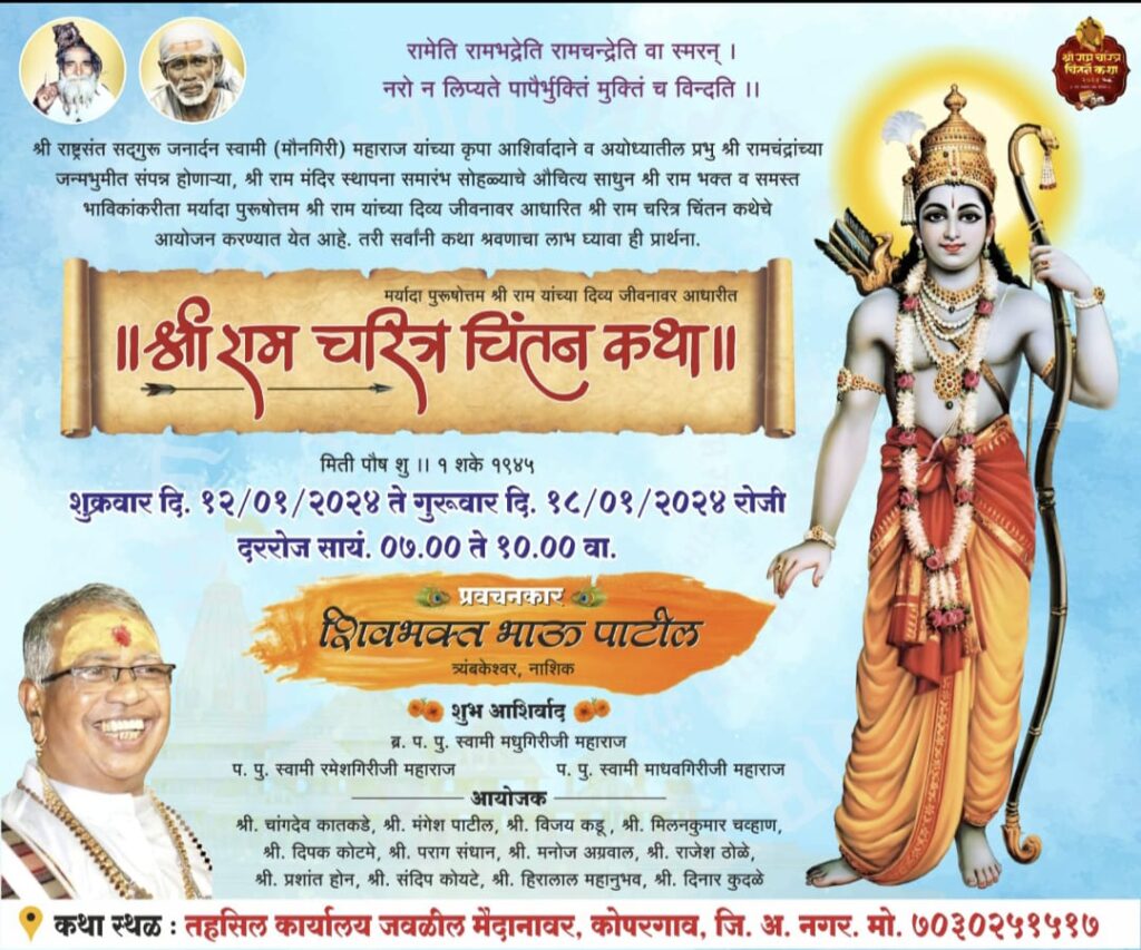 श्री राष्ट्रसंत सद्गुरु जनार्दन स्वामी (मौनगिरीजी) महाराज यांच्या कृपाशीर्वादाने व अयोध्यातील प्रभु श्री. रामचंद्राच्या जन्मभूमीत संपन्न होणाऱ्या , श्री राम मंदिर स्थापना समारंभाचे औचित्य साधून श्री राम भक्त व समस्त भाविकांकरिता मर्यादा पुरुषोत्तम श्री राम याच्या दिव्य जीवनावर आधारित श्री राम चरित्र चिंतन कथेचे आयोजन करण्यात येत आहे.तरी सर्वांनी कथा श्रावणाचा लाभ घ्यावा ही विनंती.