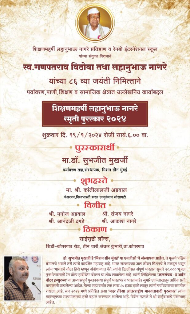 गेल्या अनेक वर्षांपासून सामाजिक व शैक्षणिक कार्यात अग्रेसर असणाऱ्या कोपरगाव येथील शिक्षणमहर्षी लहानुभाऊ नागरे प्रतिष्ठान व रेनबो इंटरनॅशनल स्कूलच्या माध्यमातून सामाजिक, शैक्षणिक, सांस्कृतिक, राजकीय, सहकार, शेती, जलसिंचन व पर्यावरण आदी क्षेत्रात उल्लेखनीय कार्य करणाऱ्या व समाजासाठी अविरतपणे झटणाऱ्या आदर्श व्यक्तींना पुरस्काराने सन्मानित करून त्यांचे कार्य समाजापुढे आणण्याची व त्यांच्या गौरवाची परंपरा कायम ठेवत यंदाचा शिक्षणमहर्षी लहानुभाऊ नागरे स्मृती पुरस्कार प्रख्यात पर्यावरण तज्ञ, ग्रीन मुंबई मिशनचे संस्थापक डॉ. सुभजीत मुखर्जी यांना नुकताच जाहीर झाला आहे.