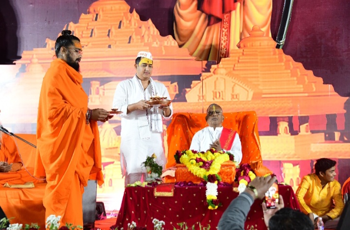 या धार्मिक सोहळ्यामुळे कोपरगाव तहसील कार्यालयाच्या मैदानाला अयोध्या नगरीचे स्वरूप आले असून श्रीराम कथा श्रवण करण्यासाठी मोठ्या प्रमाणात भाविकांची गर्दी होत असल्यामुळे संपूर्ण परिसर श्रीरामाच्या भक्तीसोहळ्यात न्हाऊन निघाला आहे. आ. आशुतोष काळे यांनी देखील या श्रीरामाच्या भक्तीसोहळ्यात सामील होवून या धार्मिक पर्वणीचा लाभ घेतला. प.पु.गुरुवर्य श्री मधुगिरीजी महाराज, प.पु. गुरुवर्य श्री रमेशगिरीजी महाराज व प.पु. गुरुवर्य श्री माधवगिरीजी महाराज व ह.भ.प. गणपतजी महाराज लोहाटे यांचे आशिर्वाद घेतले.यावेळी गौतम सहकारी बँकेच्या माजी संचालिका सौ. पुष्पाताई काळे, श्री राम कथेचे आयोजक चांगदेव कातकडे, मिलनकुमार चव्हाण, माजी नगराध्यक्ष मंगेश पाटील, कर्मवीर शंकरराव काळे सहकारी साखर कारखान्याचे संचालक दिनार कुदळे, पराग संधान, दिपक कोटमे, मनोज अग्रवाल, राजेश ठोळे, विजय कडू, प्रशांत होन, संदीप कोयटे, हिरालाल महानुभाव, राष्ट्रवादी काँग्रेस पक्षाचे पदाधिकारी, माजी नगरसेवक, कार्यकर्ते व श्री रामभक्त मोठ्या संख्येने उपस्थित होते.तहसील कार्यालयाच्या भव्य मैदानावर सुप्रसिद्ध प्रवचनकार, शिवभक्त ह.भ.प भाऊ पाटील यांच्या सुमधुर वाणीतून सुरु असलेल्या श्री राम चिंतन कथा सोहळ्यात महाआरती करतांना आ. आशुतोष काळे.