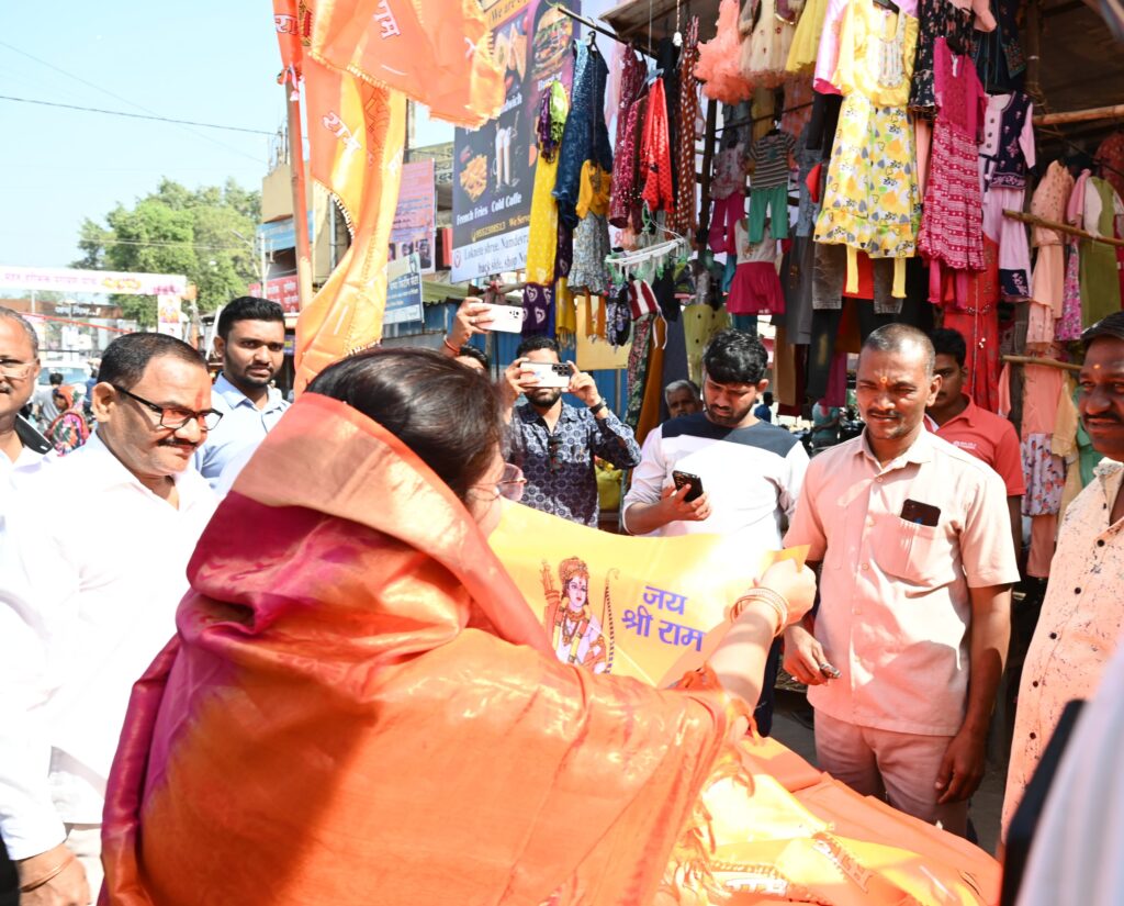कोपरगाव शहरात नागरीकांना श्री राम बॅच, मफलर,झेंडे खरेदी करून नागरिकांना वाटप करत सौ.स्नेहलताताई कोल्हे यांनी या चैतन्यमय वातावरणाचा आनंद घेतला यावेळी नागरिकांनी देखील स्वयंउत्साहाने कोल्हे यांच्या समवेत जय श्री राम नारा देत वातावरण उल्हासित झाले आहे.