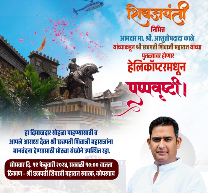 हिंदवी स्वराज्याचे संस्थापक महाराष्ट्र राज्याचे आराध्य दैवत छत्रपती शिवाजी महाराज यांच्या जयंतीनिमित्त सोमवार दिनांक १९ फेब्रुवारी रोजी सकाळी दहा वाजता छत्रपती शिवाजी महाराज यांच्या पुतळ्यावर हेलिकॉप्टर मधून पुष्प वृष्टी करण्यात येणार असल्याची माहिती आ.आशुतोष काळे यांनी दिली आहे.