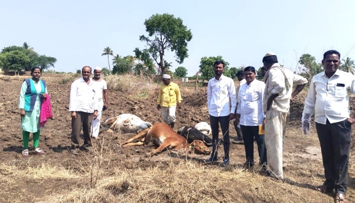 अवकाळी पावसामुळे मंगळवार (दि.१४) रोजी सायंकाळी पाच वाजेच्या सुमारास कोपरगाव तालुक्यातील बक्तरपूर येथे वादळी वाऱ्यासह गारांचा पाऊस सुरु होवून वीज पडल्यामुळे एक गाय, एक बैल व तीन मेंढ्या दगावल्या असून गारांच्या पावसामुळे डाळिंब पिकांचे देखील मोठे नुकसान झाले आहे. याबाबतचे वृत्त समजताच आ.आशुतोष काळे यांनी प्रशासनाला तातडीने पंचनामा करण्याच्या सूचना दिल्यामुळे प्रशासनाकडून पंचनामा प्रक्रिया पूर्ण करण्यात आली असून जागेवरच पशु-वैद्यकीय अधिकाऱ्यांनी मृत जनावराचे शवविच्छेदन करून झालेल्या नुकसानीचा अहवाल प्रशासनाकडे सादर केला आहे.