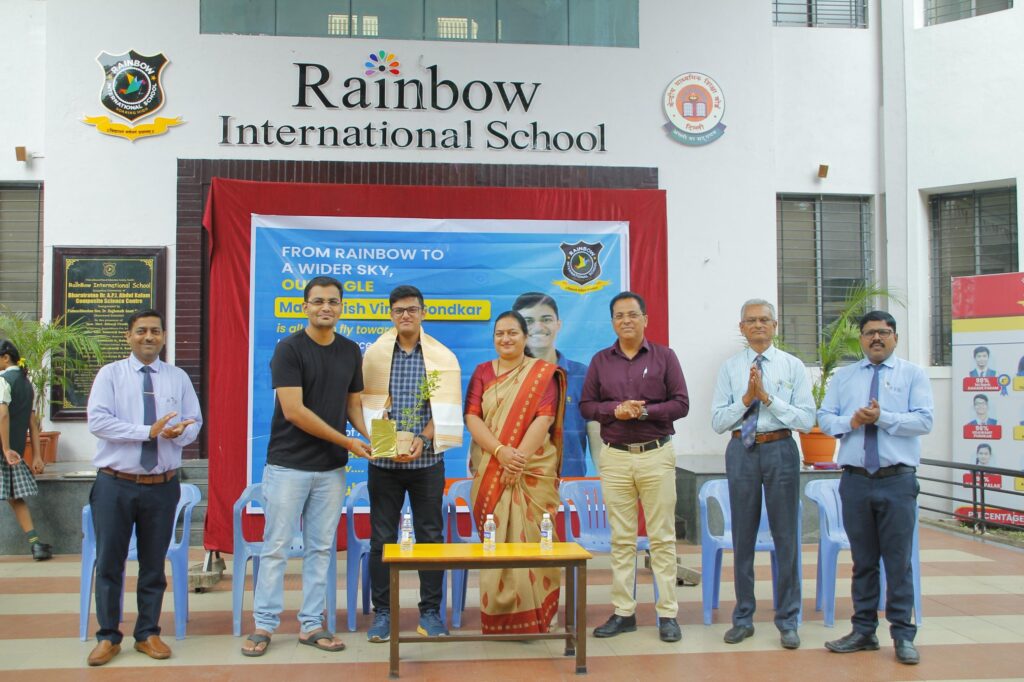 आज रेनबो शैक्षणिक संकुलात साईशच्या या उज्वल यशाचा कौतुक सोहळा त्याच्या पालकांसह आयोजित केला होता. याप्रसंगी संस्थेचे सचिव मा. संजयजी नागरे, कार्यकारी संचालक मा.आकाशजी नागरे, शैक्षणिक संचालक श्री नानासाहेब दवंगे, शैक्षणिक सल्लागार श्री अविनाश शिरसाठ, उपप्राचार्य श्री निलेश औताडे, कार्यालयीन प्रमुख श्री रवींद्र साबळे, सर्व सर्व शिक्षक वृंद व विद्यार्थी उपस्थित होते. साईशने केलेल्या नेत्र दीपक कामगिरीचे कौतुक करीत मा. आकाशजी नागरे यांनी साईश व त्याच्या पालकांचा व्यवस्थापनाच्या वतीने सत्कार केला.