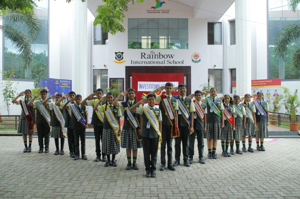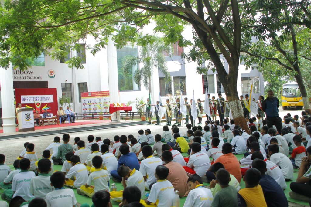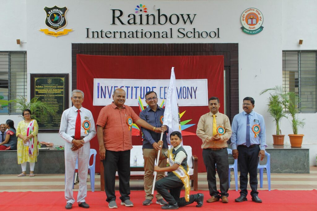 विद्यार्थ्यांना मार्गदर्शन करताना मा. दवंगे सर म्हणाले, शालेय जीवनात ज्ञानार्जन करीत प्रगतीच्या शिखराकडे जात असताना यशाचे अनेक उंबरठे नेत्रदीपक गुणवत्तेने पार करावेत. परंतु त्याच सोबत स्वयंशिस्त, सामाजिक नीतिमूल्य, नैतिकता व आदर्शाचे वास्तव धडे देखील घेतले पाहिजेत. यातूनच परिपूर्ण व्यक्तिमत्व घडत असतं. कार्यक्रमाचे आभार व्यक्त करताना श्री निलेश औताडे सर म्हणाले की, स्व. अण्णांच्या स्फूर्तीदायी व प्रेरणादायी विचारधारेवरच रेनबो शैक्षणिक संकुलाची यशस्वी वाटचाल चालू आहे. आजचा हा नेत्रदीपक सोहळा त्याचीच परिणीती आहे.त्यांनी उपस्थित मान्यवरांचे आभार व्यक्त केले. तसेच सर्व शिक्षक वृंद व विद्यार्थ्यांनाही धन्यवाद दिले. संस्थेचे अध्यक्ष मा. कांतीलालजी अग्रवाल, विश्वस्त मा. मनोजजी अग्रवाल, मा. आनंदजी दगडे , सौ. वनिताताई नागरे आदी पदाधिकाऱ्यांनी शालेय मंत्रिमंडळाच्या सर्व सदस्यांचे अभिनंदन करून त्यांना पुढील वाटचालीसाठी शुभेच्छा दिल्या. कार्यक्रमाचे बहारदार सूत्रसंचालन शिक्षक जी. एम. पगारे व मि. पॉल यांनी केले.