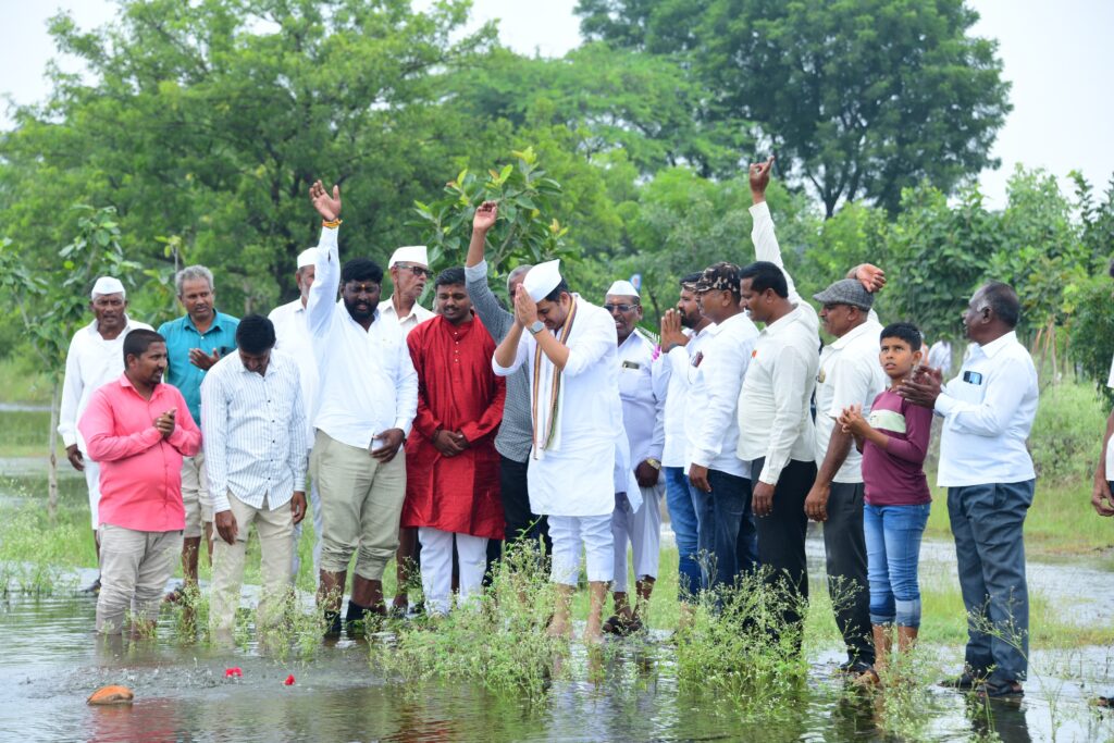 रांजणगाव देशमुख येथे निळवंडे कालव्यातून भरलेल्या बंधाऱ्याच्या पाण्याचे जलपूजन करतांना आ. आशुतोष काळे.
