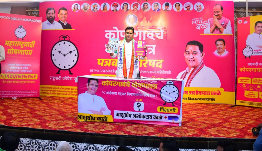 कृष्णाई मंगल कार्यालयात राष्ट्रवादी कॉंग्रेस पक्षाच्या वतीने आयोजित करण्यात आलेल्या प्रत्येक पक्षाच्या जाहीरनाम्याचे एकत्रिपणे प्रकाशन करून उपमुख्यमंत्री ना.अजितदादा पवार यांनी दूरदृश्य प्रणालीद्वारे उपस्थित कार्यकर्त्यांना संबोधित करून राष्ट्रवादी कॉंग्रेस पक्षाच्या महाराष्ट्रवादी घोषणापत्राचे अनावरण केले. याप्रसंगी उपस्थित कार्यकर्त्याशी व पत्रकारांशी आ. आशुतोष काळे यांनी संवाद साधतांना मतदार संघाच्या विकासाचा मेगा प्लान जाहीर करतांना सांगितले की, पाच वर्षात मतदार संघातील जनतेच्या आशीर्वादाने व सहकार्याने विकासाचे अनके प्रश्न सोडविले आहेत तर काही प्रश्न येत्या काही दिवसात मार्गी लागणार आहेत. यापुढील काळात गोदावरी खोऱ्याचे कमी झालेल्या पाण्याची तुट भरून काढण्यासाठी पश्चिमेला समुद्राला वाहून जाणारे पाणी गोदावरी खोऱ्यात लवकरात लवकर कसे वळविले जाईल यासाठी पाठपुरावा करणार आहे.गोदावरी कालव्यांची व पालखेड कालव्यांची दुरुस्ती तसेच निळवंडे कालव्यांच्या कामाला गती देवून लाभ क्षेत्रातील शेतकऱ्यांच्या बांधापर्यंत पाणी पोहोचवायचे आहे.मतदार संघातील कोल्हापूर टाईप बंधाऱ्यांचे दरवाजे स्वयंचलीत करून या बंधाऱ्यांचे सेतूत रुपांतर करून दळणवळण अधिक जलद कसे होईल यासाठी प्रयत्न करणार आहे. सोनेवाडी-सावळीविहीर सीमेवर होणाऱ्या एमआयडीसीमध्ये जास्तीत जास्त उद्योग आणून कोपरगाव शहरातील ४३३ एकर जागेवर नवीन एमआयडीसी उभारून बेरोजगारीचा प्रश्न निकाली काढायचा आहे. ग्रामीण भागातील ट्रान्सफॉर्मर ची संख्या वाढवून सबस्टेशनच्या देखील क्षमता वाढवायच्या आहेत. मतदार संघातील सर्वत्र भागामध्ये जास्तीत जास्त प्रमाणामध्ये सोलर पॉवर प्लांट उभारून शेतकऱ्यांसाठी व कोपरगाव शहरासह विविध गावातील पाणी योजनांसाठी सोलर पंप उपलब्ध करून देण्यासाठी प्रयत्न करणार आहे.कोपरगाव शहरतील के.बी.पी. विद्यालय व श्री सदगुरु गंगागीरीजी महाराज कॉलेजच्या परिसरात असलेल्या जागेवर भव्य क्रीडा संकुल उभारणार आहे. शहरात विविध ठिकाणी उद्यान विकसित करून भूमिगत गटारी व वीज वाहिन्या भूमिगत करून चांगल्या दर्जाच्या रस्त्यांच्या निर्मितींचे सुतोवाच करून आरोग्य व्यवस्थेबरोबरच शिक्षण व्यवस्था देखील बळकट करणार असल्याचे आ.आशुतोष काळे यांनी यावेळी सांगितले.यावेळी पाच वर्षात केलेल्या विकास कामांचा कार्यअहवाल आ.आशुतोष काळे यांनी प्रकाशित केला व त्यांच्या कार्यावर आधारित असलेले नवीन गीत प्रदर्शित करण्यात आले यावेळी कार्यकर्त्यांनी या गीतावर चांगलाच ठेका धरला होता. याप्रसंगी राष्ट्रवादी कॉंग्रेस, भाजपा, शिवसेना व मित्र पक्षाचे पदाधिकारी, कार्यकर्ते व नागरिक मोठ