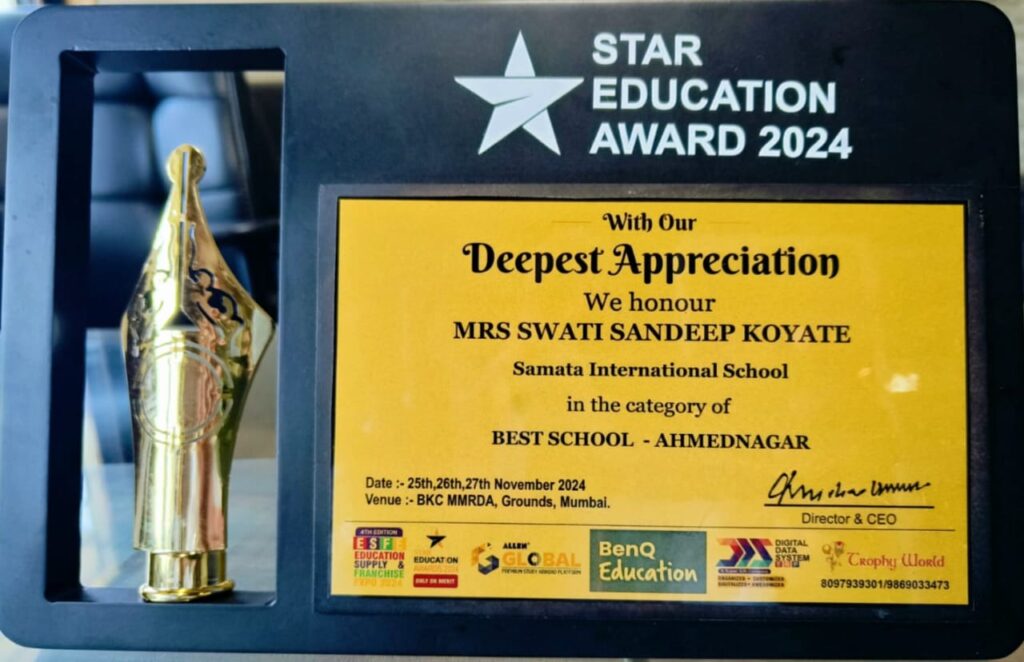 मुंबई येथील स्टार एज्युकेशन अँड एक्सलन्स संस्थेच्यावतीने महाराष्ट्र राज्यातील शैक्षणिक क्षेत्रातील शाळा, कनिष्ठ व वरिष्ठ महाविद्यालयांसाठी आयोजित ‘स्टार एज्युकेशन अँड एक्सलन्स एक्सपो २०२४’ अंतर्गत ‘बेस्ट स्कूल अवॉर्ड’ मिळाला आहे. समता इंटरनॅशनल स्कूलच्या कार्यकारी विश्वस्त सौ.स्वाती संदीप कोयटे यांना उत्कृष्ट व्यवस्थापनाबद्दल हा पुरस्कार प्रदान करण्यात आलेला आहे. सौ.स्वाती संदीप कोयटे यांच्यावतीने स्कूलचे प्राचार्य डॉ.विनोद चंद्र शर्मा यांनी मुंबई येथे झालेल्या भव्य पुरस्कार प्रदान समारंभात हा पुरस्कार स्वीकारला.