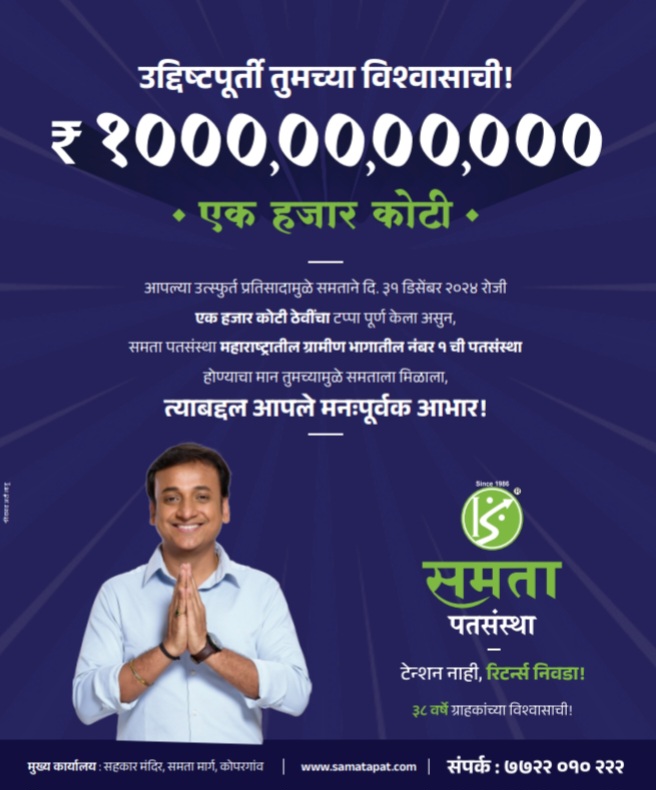 ३१ मार्च २०२५ पर्यंत आम्ही १ हजार कोटी रुपयांच्या ठेवींचा टप्पा पार करण्याचे उद्दिष्ट ठेवले होते. परंतु समता पतसंस्थेचे पदाधिकारी, अधिकारी, कर्मचारी यांच्या सहाय्याने व ग्राहकांनी दाखविलेल्या विश्वासामुळे ३१ डिसेंबर २०२४ लाच १ हजार कोटी रुपयांच्या ठेवींचा टप्पा पार केला असून १ हजार ९ कोटी रुपयांपर्यंत मजल मारली आहे.