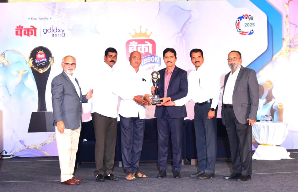 ‘बॅंको ब्ल्यू रिबन’ पुरस्कार स्विकारतांना चेअरमन देवेंद्र रोहमारे, संस्थेचे संचालक वीरेंद्र शिंदे व मॅनेजर मंगेश देशमुख व मान्यवर.