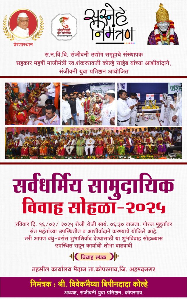 गोरगरीब शेतकरी व सर्वसामान्य माणसांना लग्न समारंभाचा खर्च परवडत नाही हे लक्षात घेऊन विवाहासाठी होणारा अनावश्यक खर्च टाळण्यासाठी व सामाजिक एकोपा राखण्यासाठी कोपरगाव येथील संजीवनी युवा प्रतिष्ठानच्या वतीने दरवर्षीप्रमाणे यंदाही सर्वधर्मीय सामुदायिक विवाह सोहळ्याचे आयोजन करण्यात आले आहे. येत्या १६ फेब्रुवारी २०२५ रोजी कोपरगाव तहसील कार्यालयाशेजारील मैदानावर सायंकाळी गोरज मुहूर्तावर हा सोहळा होणार असल्याची माहिती संजीवनी युवा प्रतिष्ठानने संस्थापक अध्यक्ष युवानेते विवेकभैय्या कोल्हे यांच्या वतीने देण्यात आली आहे.