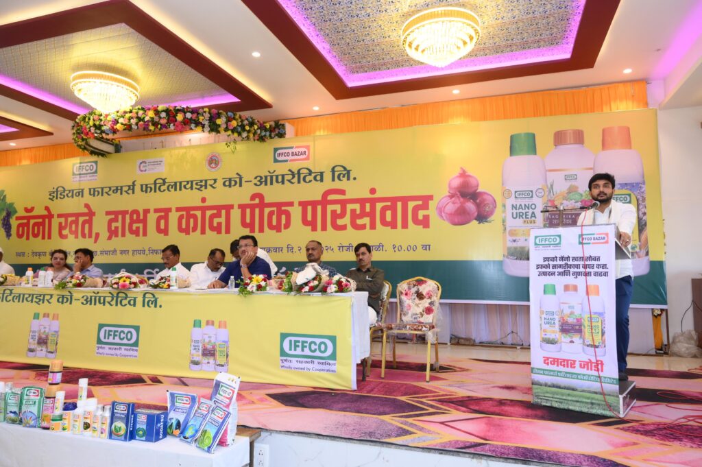 इंडियन फारमर्स फर्टिलायझर कोऑपरेटिव्ह लिमिटेडचे शुक्रवार दि. २ मे रोजी निफाड येथे नॅनो खते, द्राक्ष व कांदा पीक परिसंवाद कार्यक्रमाचे आयोजन करण्यात आले होते यावेळी प्रमुख अतिथी म्हणून इफकोचे संचालक युवानेते विवेकभैय्या कोल्हे यांनी उपस्थितांना संबोधित केले.अध्यक्षस्थानी अप्पर जिल्हाधिकारी नाशिक बाबासाहेब पारधे होते.साधनाताई जाधव संचालक इफको किसान फायनान्स नवी दिल्ली या प्रमुख पाहुणे म्हणून उपस्थित होत्या.यावेळी बोलताना इफको संचालक युवानेते विवेकभैय्या कोल्हे म्हणाले शेतीसाठी खते आता खिशात घेऊन जाता येतील.जगभरातून मागणी होते आहे.अमेरिकेसारख्या प्रगत देशात नॅनो खते निर्यात होत आहेत.ब्राझील नेपाळ यासारख्या देशात मागणी होते आहे. नाविन्यपूर्ण संकल्पना असल्याने प्रतिसाद सुरूवातील कमी होता मात्र शेतकरी अनुभवाने आणि विश्वासाने दिवसेंदिवस मागणी वाढवत आहे.नाशिक जिल्ह्यात द्राक्ष आणि कांदा उत्पादन मोठ्या प्रमाणात निर्मिती होत.निफाडमधील शेती धोरणाने जगाला दिशा देण्याचे काम आजवर केले आहे.