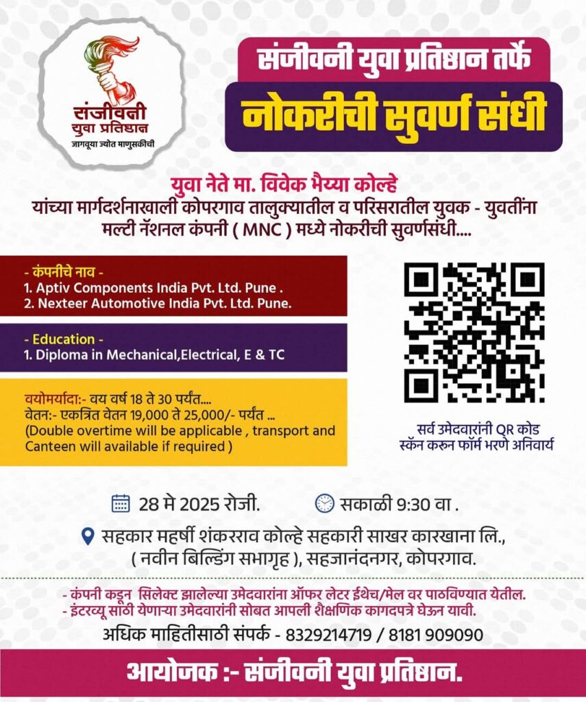संजीवनी युवा प्रतिष्ठानच्या माध्यमातून कोपरगाव तालुका व परिसरातील युवक-युवतींसाठी एक अतिशय महत्त्वपूर्ण आणि सुवर्णसंधी पुन्हा एकदा उपलब्ध झाली आहे. याअंतर्गत पुणे येथील नामांकित मल्टीनॅशनल कंपन्यांमध्ये (MNC) थेट भरतीची संधी निर्माण करण्यात आली आहे अशी माहिती देण्यात आली आहे.या रोजगार मेळाव्याच्या आयोजनामागे युवानेते मा. विवेकभैय्या कोल्हे यांचे दूरदृष्टीपूर्ण मार्गदर्शन लाभले असून, त्यांच्या प्रयत्नांतून आजवर हजारो युवकांना संजीवनी युवा प्रतिष्ठानच्या रोजगार उपक्रमांद्वारे स्थायिक नोकऱ्या मिळाल्या आहेत. या उपक्रमाद्वारे अनेक कुटुंबांचा आर्थिक कणा मजबूत केला आहे .या वेळीही पुणे येथील नामांकित कंपन्यांमध्ये डिप्लोमा इन मेकॅनिकल, इलेक्ट्रिकल आणि इलेक्ट्रॉनिक्स अँड टेलिकम्युनिकेशन (E & TC) असलेल्या उमेदवारांना नोकरीची संधी मिळणार आहे. वयाची अट १८ ते ३० वर्षांपर्यंत असून, एकत्रित पगार १९,००० ते २५,००० पर्यंत मिळणार आहे. डबल ओव्हरटाईम, ट्रान्सपोर्ट व कँटीन सुविधा देखील गरजेनुसार उपलब्ध करून दिली जाईल.रोजगार मेळाव्याची तारीख: २८ मे २०२५ असून वेळ: सकाळी ९:३० वाजता आहे तर ठिकाण: सहकार महर्षी शंकरराव कोल्हे सहकारी साखर कारखाना लि., नवीन बिल्डिंग सभागृह,सहजानंदनगर, कोपरगाव येथे ठेवण्यात आले आहे.सर्व उमेदवारांनी QR कोड स्कॅन करून फॉर्म भरणे आवश्यक आहे. सिलेक्ट झालेल्या उमेदवारांना ऑफर लेटर ई-मेलवर पाठवण्यात येईल. मुलाखतीसाठी येताना शैक्षणिक कागदपत्रे सोबत आणावीत.अधिक माहितीसाठी संपर्क करण्यासाठी 8181909090/8329214719 हे क्रमांक देण्यात आले आहेत.