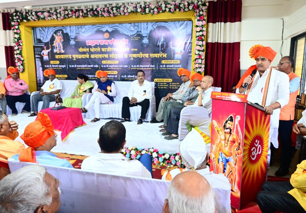 कोपरगाव शहरात ब्राह्मण सभा कोपरगाव यांच्या वतीने श्रीमंत थोरले बाजीराव पेशवे यांच्या अश्वारुढ पुतळ्याचा अनावरण सोहळा व गुणवंत विद्यार्थी गुणगौरव सोहळा शनिवार (दि.२६) रोजी मा. खा. विनय सहस्त्रबुद्धे यांच्या शुभहस्ते व आ. आशुतोष काळे यांच्या प्रमुख उपस्थितीत पार पडला याप्रसंगी ते बोलत होते.ते पुढे म्हणाले की, श्रीमंत थोरले बाजीराव पेशवे यांनी कमी वयात गाजवीलेल्या शौर्याचा मराठा बांधवांना अभिमान असून त्यांचे कार्य कधीही विसरू शकत नाही. त्यांच्या कार्याची आठवण कायम स्मरणात राहावी यासाठी पुण्यात श्रीमंत थोरले बाजीराव पेशवे यांचा पुतळा उभारण्यात आला असून त्यानंतर आपल्या कोपरगाव शहरात देखील श्रीमंत थोरले बाजीराव पेशवे पुतळा उभारण्यात आला याचा आनंद वाटतो. ब्राम्हण सभेच्या प्रत्येक कार्यात सहभागी होता येते हे माझे भाग्य आहे. आपल्यामुळे मला पुन्हा एकदा विधानसभा सदस्य म्हणून काम करण्याची संधी मिळाली. आपले आशीर्वाद असेच पाठीशी ठेवा आपल्याला माझी मदत लागल्यास मी सर्वतोपरी मदत करीन असे आ. आशुतोष काळे यांनी यावेळी सांगितले.यावेळी मा.आ.सौ. स्नेहलता कोल्हे, पुण्याच्या थोरले बाजीराव पेशवे प्रतिष्ठाणचे सचिव कुंदनकुमार साठे, विश्वस्त श्रीकांत नगरकर, चिंतामणी क्षीरसागर, पेशवे घराण्याचे वंशज चंद्रशेखर बर्वे, अखिल ब्राह्मण मध्यवर्ती संस्थेचे कोषाध्यक्ष प्रविण कुलकर्णी, कोपरगाव नगरपरिषदेचे माजी नगराध्यक्ष संजय सातभाई, कोपरगाव ब्राह्मण सभेचे अध्यक्ष मकरंद कोऱ्हाळकर, उपाध्यक्ष बाळकृष्ण कुलकर्णी, सचिव सचिन महाजन, खजिनदार जयेश बडवे, संघटक महेंद्र कुलकर्णी, गौरीष लव्हुरीकर, संदीप देशपांडे, योगेश कुलकर्णी, अजिंक्य पदे, सदस्य सौ. ऐश्वर्याताई सातभाई, प्रसाद नाईक, वसंतराव ठोंबरे, संजीव देशपांडे, अनिल कुलकर्णी, डॉ. मिलिंद धारणगावकर, सदाशिव धारणगावकर, अॅड. श्रद्धा जवाद, सौ. वंदना चिकटे आदी मान्यवरांसह गुणवंत विद्यार्थी, राष्ट्रवादी काँग्रेस पक्षाचे पदाधिकारी, माजी नगरसेवक, कार्यकर्ते व ब्राम्हण समाज बांधव मोठ्या संख्येने उपस्थित होते.