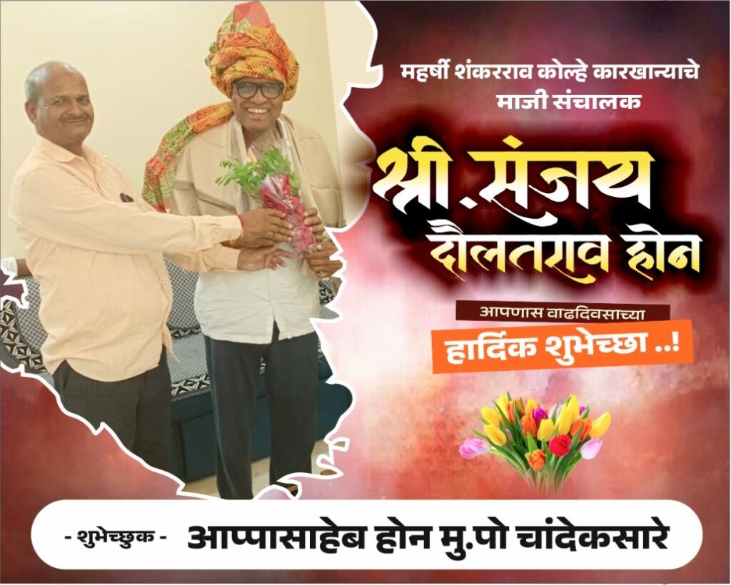 महर्षी शंकरराव कोल्हे कारखान्याचे माजी संचालक संजय दौलतराव होन यांना वाढदिवसाच्या हार्दिक शुभेच्छा.शुभेच्छुक- आप्पासाहेब पांडुरंग होन मु. पो. चांदेकसारे