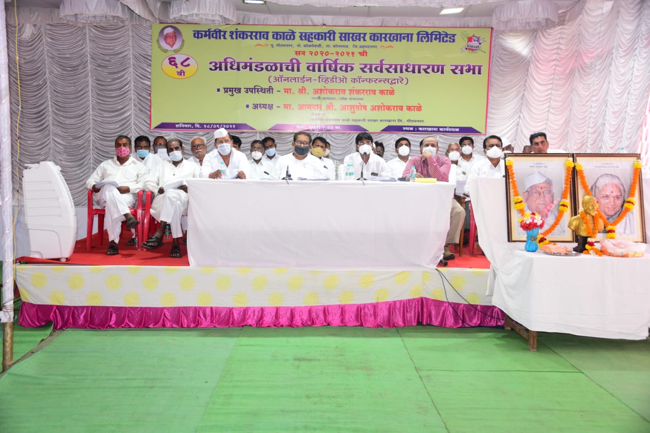 सहकार क्षेत्रात अग्रगण्य असणाऱ्या कोपरगाव तालुक्यातील कर्मवीर शंकरराव काळे सहकारी साखर कारखान्याची ६८ वी वार्षिक सर्वसाधारण सभा कारखान्याचे ज्येष्ठ मार्गदर्शक, संचालक माजी आमदार अशोकराव काळे यांच्या अध्यक्षतेखाली ऑनलाईन पद्धतीने संपन्न झाली. अध्यक्षीय पदाची सूचना दिलीप शिंदे यांनी मांडली सदर सूचनेस धर्मा दहे यांनी अनुमोदन दिले. प्रकृती अस्वस्थ असल्यामुळे कारखान्याचे चेअरमन आ.आशुतोष काळे उपस्थित शकले नाही त्यामुळे त्यांच्या वतीने त्यांचे मनोगत कारखान्याचे जनरल मॅनेजर सुनील कोल्हे यांनी मांडले. यावेळी कारखान्याचे व्हा. चेअरमन सुधाकर रोहोम, सर्व संचालक मंडळ, कारखान्याचे कार्यकारी संचालक गिरीश जगताप, जनरल मॅनेजर सुनील कोल्हे, आसवनीचे जनरल मॅनेजर ज्ञानेश्वर आभाळे, सेक्रेटरी बाबा सय्यद, असि. सेक्रेटरी एस.डी. शिरसाठ, कारखान्याचे सर्व पदाधिकारी सामाजिक अंतर ठेवून उपस्थित होते.