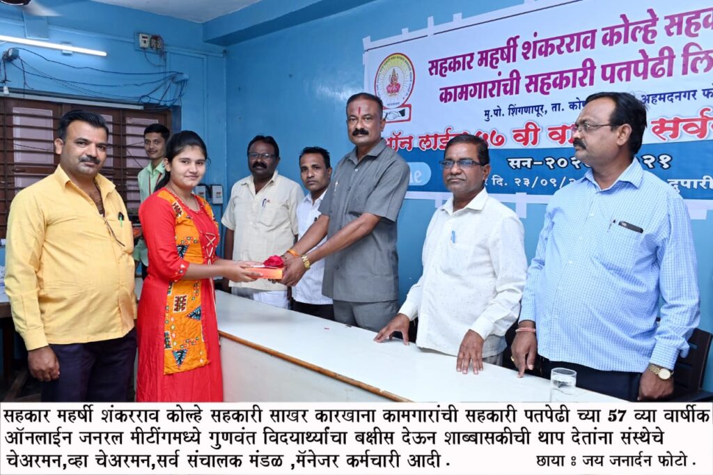 येथील सहकारमहर्षि शंकरराव कोल्हे साखर कामगार पतपेढी सभासदांच्या ६४ मुलांनी इयत्ता दहावी बारावी मध्ये विशेष प्राविण्य गुणवत्ता मिळविल्याबददल त्यांचा कोरोना नियम पाळत रोख बक्षिस पारितोषकासह सत्कार करण्यांत आला त्याप्रसंगी ते बोलत होते. ५७ व्या वार्षीक सर्वसाधारण सभेचे औचित्य साधत प्रारंभी उपाध्यक्ष दत्तात्रय पवार यांनी प्रास्तविक केले. याप्रसंगी कार्यकारी संचालक बाजीराव जी. सुतार, साखर सरव्यवस्थापक शिवाजीराव दिवटे, रासायनिक विभागाचे व्यवस्थापकीय व्यवस्थापक प्रकाश डुंबरे, हेड ग्रुप एच. आर पी. जी. गुरव, मुख्य लेखापाल एस. एन. पवार, उपमुख्य लेखापाल प्रविण टेमगर, सर्व खाते प्रमुख, उपखातेप्रमुख, संचालक आर. एस. लोंढे, यु. पी. आहेर, ए. एस. नाईकवाडे, आर. एम. डमाळे, डी. बी. केकाण, तज्ञ संचालक एस बी जाधव, निमंत्रीत संचालक बी. ए. कदम आदि उपस्थित होते. श्री. बाळासाहेब शेटे पुढे म्हणाले की, ग्रामिण भागातील मुला मुलींना बालवाडी पासुन ते पी एच डी पर्यंत दर्जेदार शिक्षण मिळावे म्हणून माजीमंत्री शंकरराव कोल्हे यांनी संजीवनी एज्युकेशन सोसायटी अंतर्गत सर्व दालने खुली केली आहेत. शिक्षणातुन कुटूंबाचा उध्दार करण्यात त्यांनी आधूनिक सहकारमहर्षिसह कर्मवीरांची भूमिका बजावली आहे. त्यांचे नातु व जिल्हा सहकारी बँकेचे संचालक विवेक कोल्हे हे देखील त्याच तळमळीने मुलांनी शिकुन जीवनांत प्रगती करावी म्हणून सातत्याने लक्ष देत असतात. दहावी बारावी गुणवंत विद्यार्थ्यांना हे प्रोत्साहन असुन त्यांनी जीवनांत स्वतःबरोबरच गावचे व संस्थेचे नांव मोठे करून देशाच्या प्रगतीत योगदान द्यावे असे ते शेवटी म्हणाले. सुत्रसंचलन संचालक चंद्रकांत जाधव यांनी केले तर व्यवस्थापक राजेंद्र सोनवणे यांनी आभार मानले.