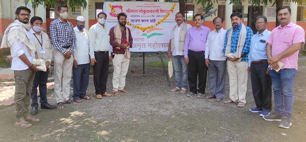 श्रीमान गोकुळचंदजी विद्यालयात आज बुधवार दिनांक १३आॕक्टोबर रोजी “भारतीय स्वातंत्र्याच्या अमृत महोत्सवी फलकाचे” अनावरण कोपरगाव येथिल सामाजिक कार्यकर्ते मसुटा या चित्रपटाचे निर्माता लेखक आणि आगामी मास्क या चित्रपटाचे निर्माता श्री.भरत मोरे यांच्या हस्ते व माझा ज्ञानोबा या प्रसिद्ध टी.व्ही.मालिकेचे सहाय्यक लेखक सुदर्शन खडांगळे,कलाकार रमेश टीक्कलसर,लघु चित्रपट निर्माता रोहीत काले, यांच्या उपस्थितीत पार पडले.कार्यक्रमाच्या अध्यक्ष स्थानी सुर्यतेज संस्थचे संस्थापक अध्यक्ष, स्वच्छता दुत व माजी विदयार्थी सुशांत घोडके होते.
