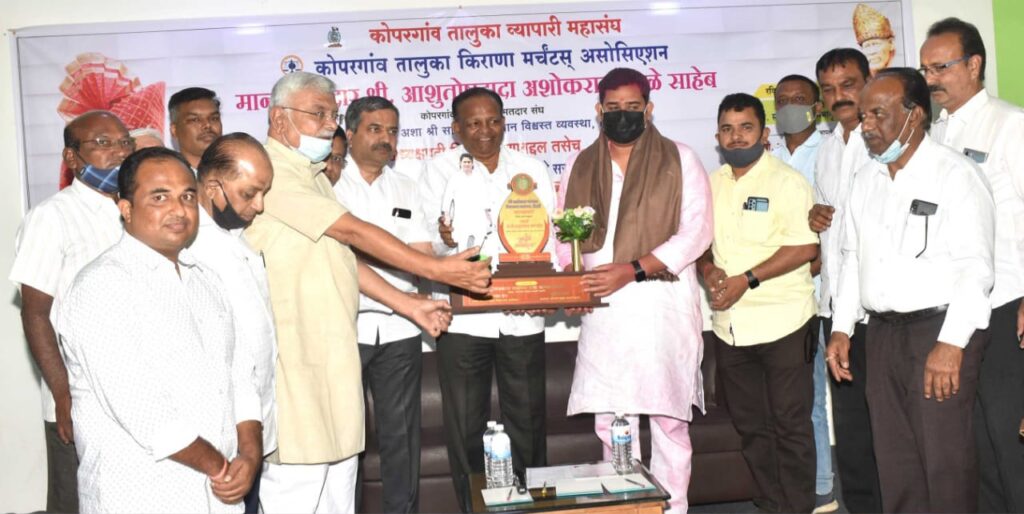 जगप्रसिद्ध साईबाबा संस्थान विश्वस्त व्यवस्था शिर्डीच्या अध्यक्ष पदी निवड आणि कोपरगाव शहरातील पूरग्रस्त व्यापाऱ्यांना राज्यसरकारच्यावतीने सरकारी मदत मिळवून दिल्याबद्दल कोपरगाव तालुका व्यापारी महासंघ आणि कोपरगाव तालुका किराणा मर्चंट असोसिएशनचे वतीने २४ ऑक्टोबर २०२१ रोजी समता नागरी सहकारी पतसंस्थेच्या स्व यशवंतराव चव्हाण समता सहकार सभागृहात व्यापारी महासंघाचे अध्यक्ष ओमप्रकाश दादाप्पा तथा काका कोयटे आणि किराणा मर्चंट असोसिएशनचे अध्यक्ष राजकुमारजी बंब यांच्या हस्ते नागरी सत्कार करण्यात आला.प्रसंगी कोपरगाव शहरात व्यापाऱ्यांच्या विविध समस्या व त्यावर प्रशासनाकडून असलेल्या अपेक्षा या संदर्भात व्यापारी महासंघ,किराणा मर्चंट असोसिएशन, विविध व्यापारी संघटना आणि आमदार आशुतोष काळे, उपस्थित कोपरगाव नगरपालिकेचे नगरसेवक यांच्यात विचार विनिमय बैठक पार पडली.नागरी सत्कार सोहळा आणि विचार विनिमय बैठकीचे अध्यक्ष व्यापारी महासंघाचे अध्यक्ष ओमप्रकाश दादाप्पा तथा काका कोयटे होते.नागरी सत्काराला उत्तर देताना कोपरगाव तालुक्याचे आमदार आशुतोष काळे म्हणाले की, कोरोना महामारीमुळे कोपरगाव शहरातील व्यापारी वर्ग अडचणीत आला असून ग्राहक संरक्षण कायद्याच्या अनुषंगाने व्यापाऱ्यांच्या समस्या सोडविण्याचा प्रयत्न करणार असून समृद्धी महामार्गाचे काम राज्य सरकार कडून लवकरात लवकर करून घेण्याचा प्रयत्न करणार आहे. कोपरगाव शहरातील अनेक कामांसाठी १२ कोटी निधी आजपर्यंत मिळवून दिला असून नगरपालिकेच्या माध्यमातून शहरातील छोटया-मोठ्या व्यापाऱ्यांच्या मूलभूत समस्या सोडवून शहारासाठी जास्तीत जास्त निधी उपलब्ध करून कोपरगावच्या व्यापाऱ्यांना शिर्डीसह आजूबाजूच्या तालुक्यातही व्यापार कसा करता येईल याचा विचार करणार आहे.अध्यक्षीय मनोगतातून काका कोयटे म्हणाले की,कोपरगाव तालुक्याचे आमदार आशुतोष काळे हे महाराष्ट्रातील आमदारांमध्ये विकासाच्या बाबतीत पहिल्या १० मध्ये असून त्याचे कार्य कर्तृत्वामुळे शिर्डी विश्वस्त व्यवस्थेचे अध्यक्ष पद मिळाल्यामुळे त्यांना चांगली संधी मिळाली असून नवीन ओळख निर्माण करण्याची संधी प्राप्त झाली आहे.तसेच व्यापारी महासंघाचे छोटे-मोठे व्यापारी हे स्वतःच्या खिशाला कात्री लागली तरी सामाजिक दायित्व सोडत नाही.त्यामुळे कोपरगाव तालुक्याचा विकास करताना कोपरगावची बाजारपेठ ओस पडू नये यासाठी शहरातील व्यापाऱ्यांच्या मूलभूत समस्यांकडे लक्ष देऊन त्या सोडवाव्यात. विशेषतः शहरातील रस्ते, स्वच्छ पाणी यांसह भाजी मार्केट प्रमाणे फळांचे मार्केट, ग्रामीण भागातून शहरात येणाऱ्या ग्राहकांसाठी पार्किंग व्यवस्था आणि समृध्दी महामार
