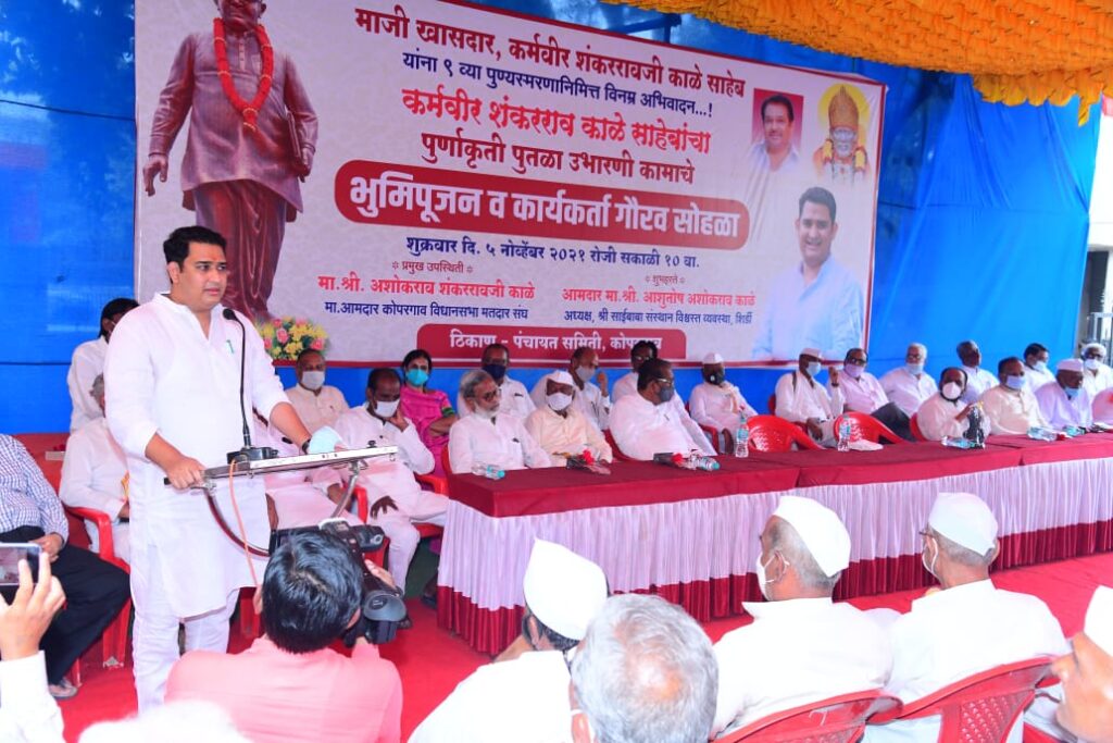 ज्या व्यक्तींनी स्वहित बाजूला ठेवून समाजासाठी आपलं आयुष्य वेचलं, त्यांच्या निस्वार्थी समाजसेवेतून समाजहित जोपासलं जावून चांगला समाज निर्माण होण्यास मदत होते अशा व्यक्तींची स्मारके आणि पुतळे उभारली जातात. अशा महान व्यक्तींचे पुतळे त्यांनी केलेल्या समाजकार्याची सातत्याने आठवण देत असतात. त्याप्रमाणे पंचायत समितीच्या प्रांगणात कर्मवीर शंकररावजी काळे यांचा पूर्णाकृती पुतळा उभारला जाणार हे त्यांनी आजीवन केलेल्या निस्वार्थ जनसेवेची पावती असल्याचे प्रतिपादन आ. आशुतोष काळे यांनी केले.कर्मवीर शंकररावजी काळे साहेब यांच्या ९ व्या पुण्यस्मरण दिनानिमित्त पंचायत समिती कोपरगाव येथे कर्मवीर शंकररावजी काळे यांचा पूर्णाकृती पुतळा उभारणी कामाचे भूमीपूजन मा.आ. अशोकराव काळे यांच्या प्रमुख उपस्थितीत व आमदार आशुतोष काळे यांच्या शुभहस्ते पार पडले याप्रसंगी ते बोलत होते. कार्यक्रमाच्या अध्यक्षस्थानी छबुराव आव्हाड होते.यावेळी कोपरगाव तालुका एज्युकेशन सोसायटीचे अध्यक्ष अशोकराव रोहमारे, राज्य सहकारी पतसंस्था फेडरेशनचे अध्यक्ष काकासाहेब कोयटे, गौतम सहकारी बँकेचे चेअरमन बाबासाहेब कोते, नगराध्यक्ष विजय वहाडणे, जिल्हा परिषद सदस्य राजेश परजणे, राजेंद्र जाधव, कर्मवीर शंकरराव काळे मित्र मंडळाचे अध्यक्ष कारभारी आगवण, पद्माकांत कुदळे,सुधाकर आवारे,कैलासशेठ ठोळे, विजय बंब,प्रशांत वाबळे,पंचायत समिती सभापती सौ. पौर्णिमा जगधने, उपसभापती अर्जुनराव काळे, कर्मवीर शंकरराव काळे सहकारी साखर कारखान्याचे उपाध्यक्ष सुधाकर रोहोम, सर्व संचालक मंडळ, राष्ट्रवादीचे जिल्हा परिषद, पंचायत समिती सदस्य, नगरसेवक, राष्ट्रवादी काँग्रेस पक्षाचे पदाधिकारी, कार्यकर्ते नागरिक आदी मान्यवरांसह कर्मवीर शंकररावजी काळे यांच्या समवेत सामाजिक योगदान देणारे जेष्ठ कार्यकर्ते मोठ्या संख्येने उपस्थित होते. यावेळी कर्मवीर शंकररावजी काळे यांच्या सामाजिक, राजकीय वाटचालीत त्यांच्या समवेत सामाजिक योगदान देणाऱ्या जेष्ठ कार्यकर्त्यांचा आ.आशुतोष काळे यांच्या हस्ते सन्मानचिन्ह देवून गौरव करण्यात आला.यावेळी पुढे बोलतांना आ. आशुतोष काळे म्हणाले की, चांगला समाज निर्माण व्हावा यासाठी योग्य प्रेरणा व मार्गदर्शन मिळणे आवश्यक असते. कर्मवीर शंकररावजी काळेसाहेबांनी आजीवन समाजाची निस्वार्थपणे सेवा केली. त्यांच्या निस्वार्थ समाजसेवेची प्रेरणापंचायत समिती आणि तहसील कार्यालयात कामानिमित्त येणाऱ्या नागरिकांना निश्चितपणे मिळणार असून चांगला समाज निर्माण होईल. कर्मवीर शंकररावजी काळे साहेबांनी शिक्षण, सहकार आणि सामाजिक जीवनात जे काही समाजकार्य केले त्यामध्ये त्यांना साथ देणाऱ्या प्रत्य