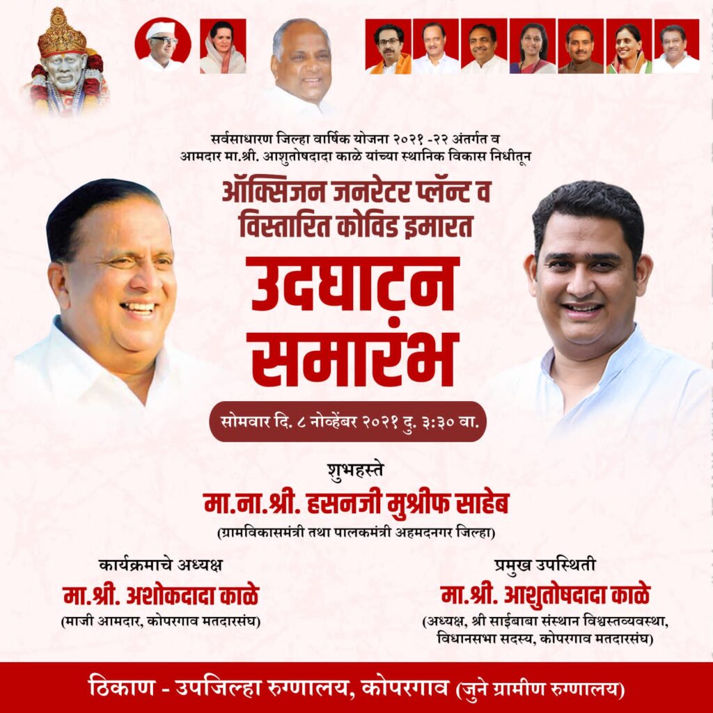 जीवघेण्या कोरोना विषाणूचा संसर्ग रोखण्यासाठी व नागरिकांचे आरोग्य आ.आशुतोष काळे यांनी काळाची गरज ओळखून बांधण्यात आलेल्या ५० बेडच्या कोविड हॉस्पिटलचे व ऑक्सिजन प्लांटचे लोकार्पण राज्याचे ग्रामविकास मंत्री तथा जिल्ह्याचे पालकमंत्री ना.हसन मुश्रीफ यांच्या हस्ते माजी आमदार अशोकराव काळे यांच्या अध्यक्षतेखाली उद्या सोमवार (दि.८) रोजी दुपारी ३.०० वाजता होणार असल्याची माहिती आ.आशुतोष काळे यांच्या जनसंपर्क कार्यालयाकडून देण्यात आली आहे.मागील वर्षी आलेल्या कोरोना विषाणूचा प्रादुर्भाव वाढू नये यासाठी आ.आशुतोष काळे यांनी एस.एस.जी.एम.महाविद्यालयात १०० ऑक्सिजन बेडचे डेडिकेटेड कोविड केअर सेंटर व ५०० बेडचे कोविड केअर सेंटर उभारून व आरोग्य विभागासाठी आवश्यक साधन सामुग्री व साहित्याचा पुरवठा केल्यामुळे कोपरगाव तालुक्यात कोरोनाचा संसर्ग नियंत्रणात ठेवण्यात मोठे यश मिळाले व कोरोनाच्या पहिल्या लाटेला परतावून लावले.त्यानंतर आलेली दुसरी लाट मोठ्या प्रमाणात घातक होती. त्यावेळी ऑक्सिजन व ऑक्सिजन बेडची मोठ्या प्रमाणात टंचाई जाणवत होती व आरोग्य विभागाकडून देखील कोरोनाची तिसरी लाट येण्याचे संकेत देण्यात आले होते.त्या पार्श्वभूमीवर आ.आशुतोष काळे यांनी भविष्यात येणाऱ्या संकटाची चाहूल ओळखून कोपरगाव ग्रामीण रुग्णालयात विस्तारित ५० बेडचे कोविड हॉस्पिटल व ऑक्सिजन प्लांट उभारणीचा निर्णय घेऊन तातडीने काम सुरू केले होते.हे काम नुकतेच पूर्ण झाले असून कोरोना बाधित रुग्णांच्या सेवेसाठी ५० बेडचे कोविड हॉस्पिटल व ऑक्सिजन प्लांट सज्ज झाला आहे.त्यामुळे कोरोना बाधित रुग्णांची कायमस्वरूपी सोय होणार असून या ५० बेडचे कोविड हॉस्पिटल व ऑक्सिजन प्लांटचे लोकार्पण पालकमंत्री ना.हसन मुश्रीफ यांच्या हस्ते होणार असून या कार्यक्रमासाठी कार्यकर्त्यांनी आवर्जून उपस्थित राहावे असे आवाहन आ.आशुतोष काळे यांच्या जनसंपर्क कार्यालयाच्या वतीने करण्यात आले आहे.