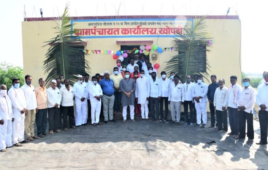 खोपडी येथे जिल्हा परिषद जनसुविधा योजनेअंतर्गत बांधण्यात आलेल्या ग्रामपंचायत कार्यालय इमारतीचे लोकार्पण प्रसंगी आ. आशुतोष काळे व मान्यवर. यावेळी भाजपचे लोकनियुक्त सरपंच, उपसरपंच यांनी राष्ट्रवादी काँग्रेस पक्षात प्रवेश केला.