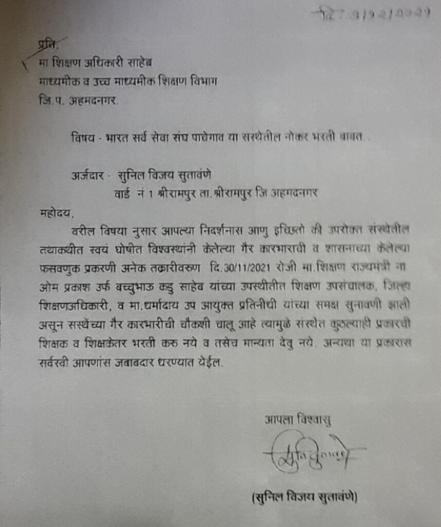 श्री. सुनिल सुतावंणे यांनी प्रसिध्दीस दिलेल्या निवेदनात पुढे म्हटले आहे की, भारत सर्व सेवा संघ पाचेगांव या संस्थेतील तथाकथीत स्वयंघोषीत विश्वस्थांनी केलेल्या गैर कारभाराची व शासनाच्या केलेल्या फसवणुकीच्या असंख्य तकारी वरून ३० नोव्हेंबर २०२१ रोजी शालेय शिक्षण राज्यमंत्री नामदार ओमप्रकाश उर्फ बच्चु कडु यांनी माध्यमिक व उच्च माध्यमिक शिक्षण संचालनालयाचे संचालक यांना सदर चौकशी करून १५ दिवसांचे आत अहवाल सादर करण्यांबाबत कळविले आहे., असे असतांनाही स्वयंघोषीत विश्वस्थ हे बेकायदेशीर अनुकंपाखाली शिक्षक भरती करण्यांच्या तयारीत आहेत त्याप्रमाणे त्यांनी संबंधीत शिक्षकाकडुन याबाबत हालचाली सुरू केलेल्या आहेत. या संस्थेची चौकशी सुरू केली आहे, तरी याप्रकरणी स्वयंघोषीत विश्वस्थ बेकायदा शिक्षक भरती करण्यांच्या विचारात आहे यात या शिक्षकांचा बळी जाईल तरी सर्वांनी सतर्क व्हावे यादृष्टीने शिक्षणाधिकारी माध्यमिक व उच्च माध्यमिक शिक्षण विभाग जिल्हा परिषद अहमदनगर यांना लेखी निवेदन दिले आहे असेही शेवटी सुनिल सुतावणे यांनी सांगितले.