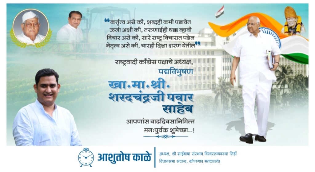 यावेळी पुढे बोलतांना ते म्हणाले की, २०१९ च्या विधानसभा निवडणुकीच्या वेळी कोपरगाव येथे झालेल्या जाहीर प्रचार सभेत भविष्यातील राज्याचे नेतृत्व करणाऱ्या प्रमुख व्यक्तीमध्ये माझा समावेश राहणार असल्याचे पवार साहेबांनी सांगितले. त्यांनी माझ्यावर एवढा मोठा विश्वास दाखविला हे मी माझे भाग्य समजतो. देशाचे माजी कृषी मंत्री,माजी संरक्षण मंत्री म्हणून त्यांनी दिलेल्या जबाबदारीला न्याय देवून देशात स्वत:ची वेगळी प्रतिमा निर्माण केली आहे. उद्योग,कृषी, महिला धोरण, साहित्य, कला, संस्कृती,खेळ अशा सर्वच क्षेत्रात पवार साहेबांचे अजोड योगदान आहे. ज्या-ज्यावेळी देशात,राज्यात संकटे येतात, संवेदनशील प्रश्न निर्माण होतात, पेचप्रसंग उदभवतात त्या त्यावेळी सत्ताधारी असो वा विरोधक पवार साहेबांचे मार्गदर्शन घेतात यावरून त्यांचे देशाच्या राजकारणातील अलौकिक महत्व अधोरेखित होते. साहेब केंद्रात मंत्री असतांना देशात मोठ्या प्रमाणात जास्त साखर उत्पादन झाले. त्यावेळी साखरेच्या बाबतीत त्यांनी योग्य भूमिका घेवून साखरेचा बफर स्टॉक,साखर निर्यात करण्याचा निर्णय, वाहतुकीचे अनुदान आदी महत्वाचे निर्णय घेतल्यामुळे खऱ्या अर्थाने साखर उद्योगाला उभारी मिळाली. तशीच परिस्थिती मागील दोन वर्षापूर्वी निर्माण झाली होती. त्यावेळी केंद्र सरकारला देखील साहेबांनी अवलंबिलेल्या धोरणांचा वापर करावा लागला. देशात असे अनेक उद्योग आहेत त्या उद्योगांना साहेबांनी योग्य दिशा देण्याचे काम केले आहे. त्यांचे राज्यासाठी व देशासाठी मोठे योगदान आहे. राज्याला यशवंतराव चव्हाण, वसंतदादा पाटील आणि पवार साहेबांचे नेतृत्व मिळाल्यामुळे राज्य आघाडीवर आहे. साहेबांना ज्या ज्यावेळी भेटलो त्यावेळी पवार साहेव मतदार संघाच्या विकासाची व माजी आमदार अशोकराव काळे यांची आपुलकीने चौकशी करीत असतात. कार्यकर्त्याला जीव कसा लावायचा हे साहेबांकडून शिकण्यासारखे आहे. साहेबांच्या विचारांवर मतदार संघाची वाटचाल सुरु असून पवार साहेबांचे विचार घराघरात पोहोचविण्याचे काम करण्याचा संकल्प राष्ट्रवादीच्या कार्यकर्त्यांनी करावा असे आवाहन आ. आशुतोष काळे यांनी यावेळी उपस्थित कार्यकर्त्यांना केले. व कोपरगाव तालुका राष्ट्रवादी कॉंग्रेस पक्षाच्या वतीने आमदार आशुतोष काळे यांनी शरदचंद्रजी पवार यांना वाढदिवसानिमित्त शुभेच्छा दिल्या. या कार्यक्रम प्रसंगी कोपरगाव शहर राष्ट्रवादी विद्यार्थी काँग्रेसच्या वतीने शरदचंद्रजी पवार यांच्या वाढदिवसानिमित्त आयोजित करण्यात आलेल्या ऑनलाईन वक्तृत्व स्पर्धेचे आ. आशुतोष काळे यांच्या हस्ते बक्षीस वितरण करण्यात आले. तसेच शाहिर किशोर सासवडे यांनी रचलेल्या व सुनील जगताप यांन