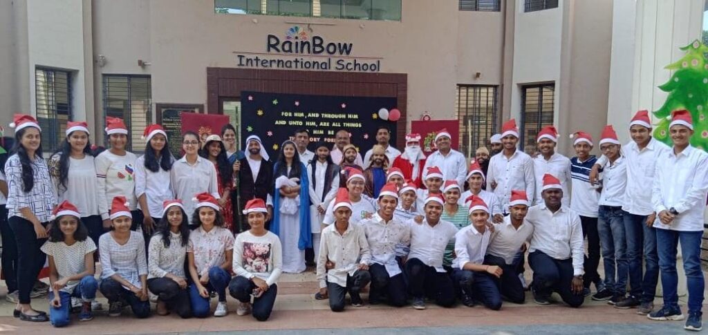 शिक्षण महर्षी लहानुभाऊ नागरे स्थापित रेन्बो इंटरनॅशनल स्कूलमध्ये दि . २४ डिसेंबर २०२१ रोजी नाताळ सण मोठ्या उत्साहात साजरा करण्यात आला . जगाला प्रेम व शांततेचा संदेश देणाऱ्या प्रभू येशू ख्रिस्तांचा जन्मोत्सव नाताळ सणरूपाने जगभरात साजरा केला जातो . एकात्मकतेचा संदेश देणारा नाताळ हा सण साजरीकरणातंर्गत विद्यार्थ्यांनी सादर केलेल्या संगीत , गायन , नृत्य , प्रभू येशू ख्रिस्त यांची ‘जन्मसोहळा नाटीका’ अशा विविध कलाविष्कारांनी वातावरण भारावून गेले होते . कलाशिक्षक दत्ता डोखे संराच्या मार्गदर्शनाखाली विद्यार्थ्यांनी प्रभू येशू ख्रिस्तांचा जन्म देखावा तयार केला तर समाजातून कोरोनारूपी संकटाचे सावट दूर व्हावे व पुनश्च एकदा एकतेने व विविधतेने नटलेले असे आनंदोत्सव धुमधडाक्यात साजरे व्हावेत अशी आशा नेहा पहाडे मॅडम यांनी आपल्या भाष्यातून व्यक्त केली . ‘ जिंगल बेल्स ‘ गाण्याच्या मधूर लहरींनी वातावरण भारावलेले असतांनाच ‘ सांताक्लॉज’ च्या रुपाने संतोष शेंदूर्णीकर सरांचे आगमण झाले आणि विद्यार्थ्यांनी प्रचंड टाळ्यांच्या गजरात त्यांचे स्वागत केले तसेच ‘ख्रिसमस फ्रेन्ड’ या