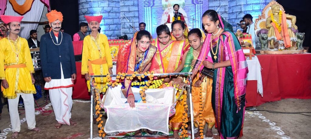 वारी येथील समाजप्रबोधानकर हभप सर्जेराव महाराज टेके यांच्या संतवाणीतून शौर्यगाथा शिवरायाची कथा वेषभूने सादरीकरण होत आहे.