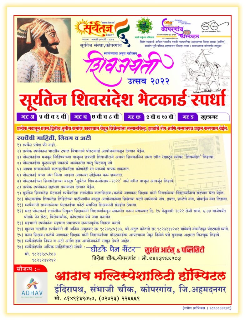 कोपरगाव येथील सूर्यतेज संस्था कोपरगाव वतीने श्रीमंंत छत्रपती शिवाजीराजे भोसले यांचे जयंती निमित्त स्वच्छ भारत अभियान, माझी वसुंधरा अभियान,सूर्यतेज कोपरगाव फेस्टिव्हल अंतर्गत अखिल भारतीय मराठी नाट्यपरिषद् अहमदनगर जिल्हा शाखा (ग्रामिण), बाल रंगभूमी परिषद,आढाव मल्टिस्पेशालिटी हाॅस्पिटल, कोपरगाव,अहमदनगर जिल्हा शाखा,कलाशिक्षक,कोपरगाव तालुका यांचे विशेष सहभागातून शिवसंदेश भेटकार्ड स्पर्धा – २०२२ आयोजन करण्यात आले असल्याची माहिती सूर्यतेज संस्थापक व स्वच्छतादूत सुशांत घोडके यांनी दिली आहे.सूर्यतेज संस्थापक व स्वच्छतादूत सुशांत घोडके यांचे संकल्पनेतून २१ वर्षांपासून शासकीय शिवजयंती उत्सव निमित्ताने शिवप्रेमींच्या सहभागातून चित्रकला,रांगोळी,बाल नाटिका अशा विविध स्पर्धात्मक उपक्रमांचे आयोजन करुन लहान मुलांमध्ये छत्रपती शिवाजीराजे यांचे विचार रुजविण्याचे कार्य निरंतर सुरू आहे.सूर्यतेज शिवसंदेश भेटकार्ड स्पर्धा करिता गट-अ (५ वी व ६ वी),गट-ब (७ वी व ८ वी),गट-क (९ वी व १० वी),गट-ड खुलागट या प्रमाणे गट तयार करण्यात आले असून प्रत्येक गटातून प्रथम, द्वितीय, तृतीय क्रमांक काढण्यात येणार आहे.