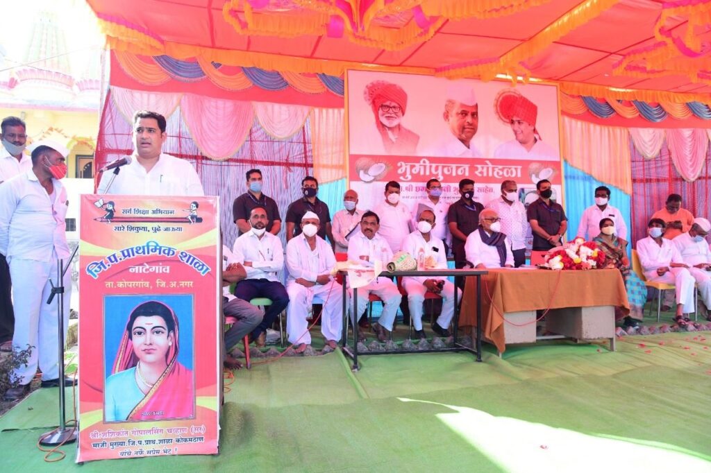 यावेळी पुढे बोलतांना ना. आशुतोष काळे म्हणाले की, येवल्याचे रस्ते राज्यात प्रसिद्ध आहेत ते ना. छगनरावजी भुजबळ यांच्यामुळेच. ज्यावेळी येवला मतदार संघात भुजबळ साहेब निवडून आले त्यावेळी येवला मतदार संघातील रस्त्यांची अवस्था देखील कोपरगाव विधानसभा मतदार संघासारखीच होती. मात्र आज हाच येवला मतदार संघ राज्यासाठी रस्त्यांच्या बाबतीत आदर्श ठरला आहे. येवला मतदार संघातील वाड्या-वस्त्यापासून ते मुख्य रस्त्यांपर्यंत असलेले चकचकीत रस्ते मतदार संघाच्या विकासाला चालना देण्यात महत्वाची भूमिका बजावत आहे. हाच आदर्श डोळ्यसमोर ठेवून मागील दोन वर्षापासून कोपरगाव विधानसभा मतदार संघाच्या रस्त्यांची झालेली दुरावस्था सुधारण्यासाठी केलेल्या प्रयत्नातून जवळपास ९५ कोटी रूपये निधी रस्त्यांसाठी आणला असून त्या निधीतून अनेक मुख्य रस्त्यांबरोबरच बहुतांश गावातील रस्त्यांचे व वाड्या-वस्त्यांवरील रस्त्यांची कामे सुरु आहेत. प्ररामा ८ या रस्त्याच्या मजबुतीकरण व डांबरीकरण कामासाठी निधी मिळावा यासाठी मी देखील प्रयत्न केले होते. मात्र प्ररामा ८ येवला तालुक्यात सुरु होवून कोपरगाव तालुक्यात संपत असल्यामुळे विधानसभेचे उपाध्यक्ष ना.नरहरी झिरवाळ व भुजबळ साहेबांच्या सहकार्याने या रस्त्यासाठी निधी मिळाला असून या निधीतून रस्त्यांची कामे होवून नागरिकांच्या अडचणी सुटत आहेत याचे मोठे समाधान असल्याचे ना. आशुतोष काळे यांनी सांगितले. यावेळी नाटेगाव येथे १६ लक्ष रुपये निधीतून करण्यात येणाऱ्या इजिमा १२ किरण कुदळे घर ते राजेंद्र मोरे घर रस्ता व १० लक्ष रुपये निधीतून करण्यात येणाऱ्या नाटेगाव ते प्ररामा ८ रस्ता, ग्रामा ८२ मध्ये किमी ०/०० ते १/५०० रस्ता मजबुतीकरण व डांबरीकरण कामाचे भूमिपूजन आणि ८.७५ लक्ष रुपये निधीतून बांधण्यात आलेल्या जिल्हा परिषद शाळा खोलीचे लोकार्पण ना. आशुतोष काळे यांच्या हस्ते करण्यात आले.