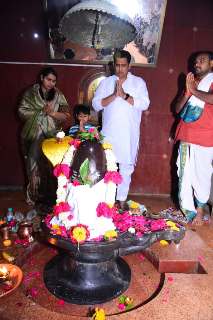 माहेगाव देशमुख येथील अमृतेश्वराचे सपत्नीक दर्शन घेतांना ना. आशुतोष काळे, सौ. चैतालीताई काळे, आयांश काळे.