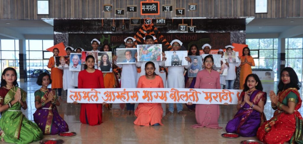 त्यानंतर मराठी साहित्यातील जेष्ठ साहित्यिक वि.वा.शिरवाडकर यांच्या प्रतिमेचे पूजन मॅनेजिंग ट्रस्टी सौ स्वाती कोयटे व शैक्षणिक संचालिका सौ लिसा बर्धन यांच्या हस्ते करण्यात आले.माध्यमिक विभागातील इ.७ वीच्या विद्यार्थ्यांनी मराठी भाषेतील विविध गीतांवर ताल धरत नृत्य सादर करून महाराष्ट्रातील मराठी भाषा,संस्कृतीचे दर्शन घडवून दिले. इ.४ थी मधील रुद्र राठोड याने पोतराज, इ.५ वी मधील श्रावणी घारकर हिने बोहरीन,इ.६ वी मधील विद्यार्थिनी राजेश्वरी तांबे हिने वासुदेवाची वेशभूषा परिधान करून लोककलांचा आविष्कार करत उपस्थितांची मने जिंकली.इ.८वी मधील विद्यार्थ्यांनी बदलत्या काळानुसार मराठी भाषेवर आधारित नाटिका सादर केली.विद्यार्थ्यांमध्ये मराठी भाषेचा इतिहास,भाषेतील शब्दांची ओळख यावर आधारित शिक्षिका भक्ती बाभूळके यांच्या मार्गदर्शनाखाली प्रश्न मंजुषा स्पर्धा घेण्यात आली.या स्पर्धेला विद्यार्थ्यांचा उत्स्फूर्त प्रतिसाद लाभला.