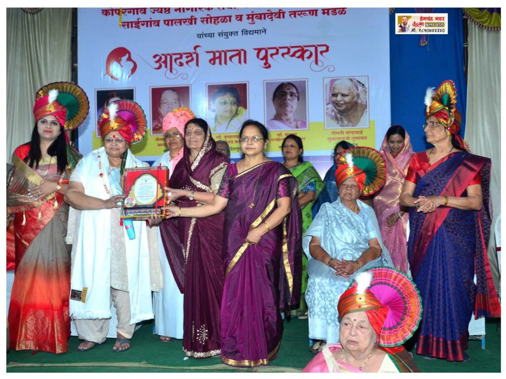 कोपरगाव ज्येष्ठ नागरिक सेवा मंच, ज्येष्ठ महिला समिती, साईगाव पालखी सोहळा व मुंबादेवी तरुण मित्रमंडळ यांच्यावतीने कोपरगाव मध्ये अभिनव उपक्रम सुरु करण्यात आला असून बुधवार (दि.०६) रोजी सौ. पुष्पाताई काळे यांच्यासह श्रीमती सिंधूताई कोल्हे, श्रीमती कमलाबाई ठोळे,मुरुमकरताई व चंदाताई लुणावत या मातांना आदर्श पुरस्कार देवून गौरविण्यात आले आहे. कोरोना काळात व समाजासाठी योगदान देणाऱ्या सुतारताई, संगीता मालकर, पुष्पाताई मुंदडा, चंदाताई कोठारी, प्रिती बंब यांचाही याप्रसंगी गौरव करण्यात आला.