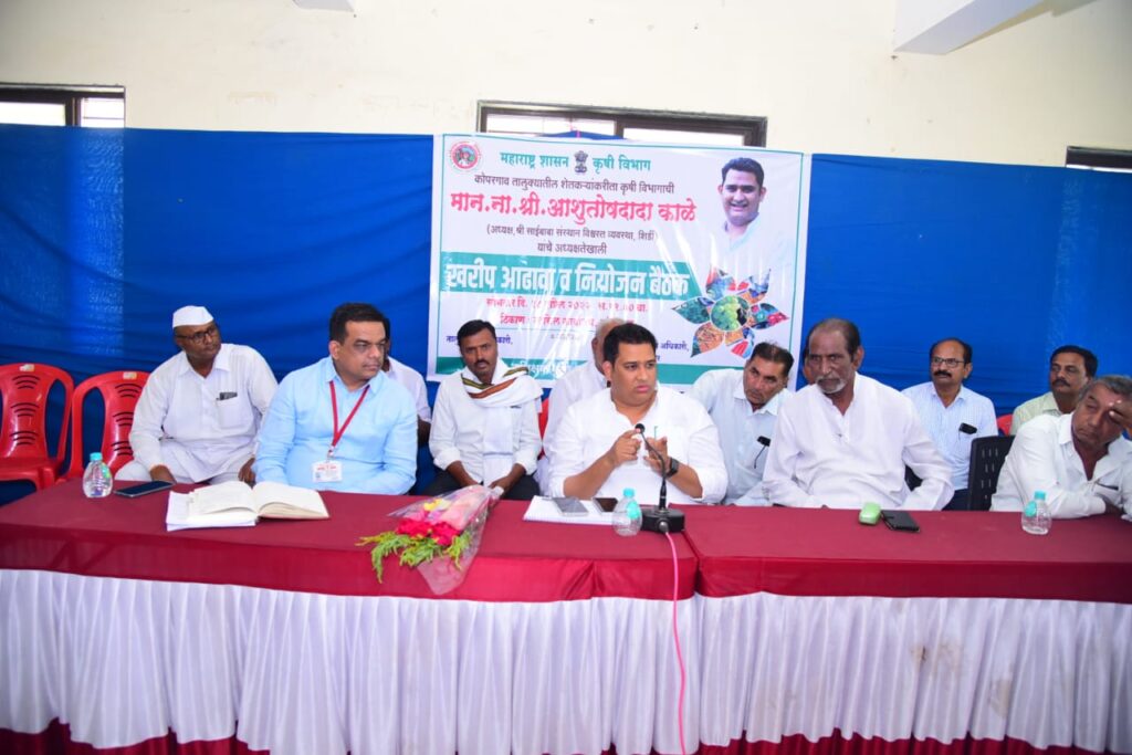 यावेळी गटविकास अधिकारी सचिन सूर्यवंशी, कृषी अधिकारी पंडित वाघिरे, मंडल कृषी अधिकारी चांगदेव जवणे, कर्मवीर शंकरराव काळे सहकारी साखर कारखान्याचे संचालक पद्माकांत कुदळे, आनंदराव चव्हाण,काकासाहेब जावळे, अशोकराव काळे, जिनिंग प्रेसिंगचे चेअरमन गोरक्षनाथ जामदार, पंचायत समिती सदस्य मधुकर टेके, अनिल कदम,श्रावण आसने, राष्ट्रवादी काँग्रेसचे शहराध्यक्ष सुनील गंगूले, गोदावरी खोरे केन ट्रान्सपोर्टचे कार्यकारी संचालक दिलीप शिंदे, विजय जाधव, एम.टी. रोहमारे, संदीप रोहमारे,रोहिदास होन, बाळासाहेब वारकर, भाऊसाहेब भाबड, सामाजिक कार्यकर्ते संजय काळे,राजेंद्र खिलारी, विठ्ठल जावळे, कौसर सय्यद,गणेश घाटे, सर्व सरपंच, उपसरपंच, कृषी विभागाचे शैलेश आहेर, आदिनाथ चंदन, कृषी सहाय्यक व शेतकरी आदी उपस्थित होते. खरीप आढावा, नियोजन बैठकीत कृषी विभागाला मार्गदर्शन करतांना ना. आशुतोष काळे.