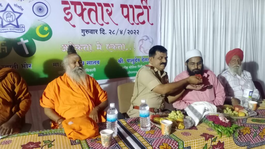 कोपरगाव शहर पोलीस स्टेशन येथे रमजान ईद अनुषंगाने मा.श्री संजय सातव उपविभागीय पोलीस अधिकारी शिर्डी उपविभाग शिर्डी यांचे उपस्थितीत इफ्तार पार्टीचे अयोजन करण्यात आले होते. इफ्तार पार्टीकरीता मशीदीचे मौलाना,मुस्लीम समाजातील प्रतिष्ठीत नागरीक यांचेसह हिंदु,ख्रिचन,बौध्द,शिख असे सर्व समाजाचे प्रमुख धर्मगुरू व समजातील प्रतिष्ठीत नागरीक उपस्थित होते.उपस्थितीत सर्वांना रमजान ईद निमित्त शुभेच्छा देवुन शांततेत ईद साजरी करण्याबाबत सुचना देवुन मार्गदर्शन करण्यात आले आहे. सदर इफ्तार पार्टीकरीता मौलाना आदिल,हिंदू धर्मगुरू श्री रमेशगिरी महाराज,फादर, अजय भोसले, गुरुद्वारा चे श्री नौनियालसिंग विक्रमसिंग पोतीवाल ,बौद्ध धर्मीय भंतेजी आनंद सुमनश्री यांचेसह प्रतिष्ठीत नागरीक रियाज शेख सर,अस्लम शेख,महेमुद सय्यद,अकीश बागवान,इमतियाज आत्तर, आब्बास शेख, सलीम पठाण, श्री विजय वाहडणे,श्री मंगेश पाटील,श्री संदिप वर्पे श्री भरत मोरे, ,श्री सनि वाघ,श्री जितेंद्र रणशुर, श्री दीपक वाजे, श्री सुशांत घोडके यांचेसह १०० ते १५० कार्यकर्ते उपस्थित होते.