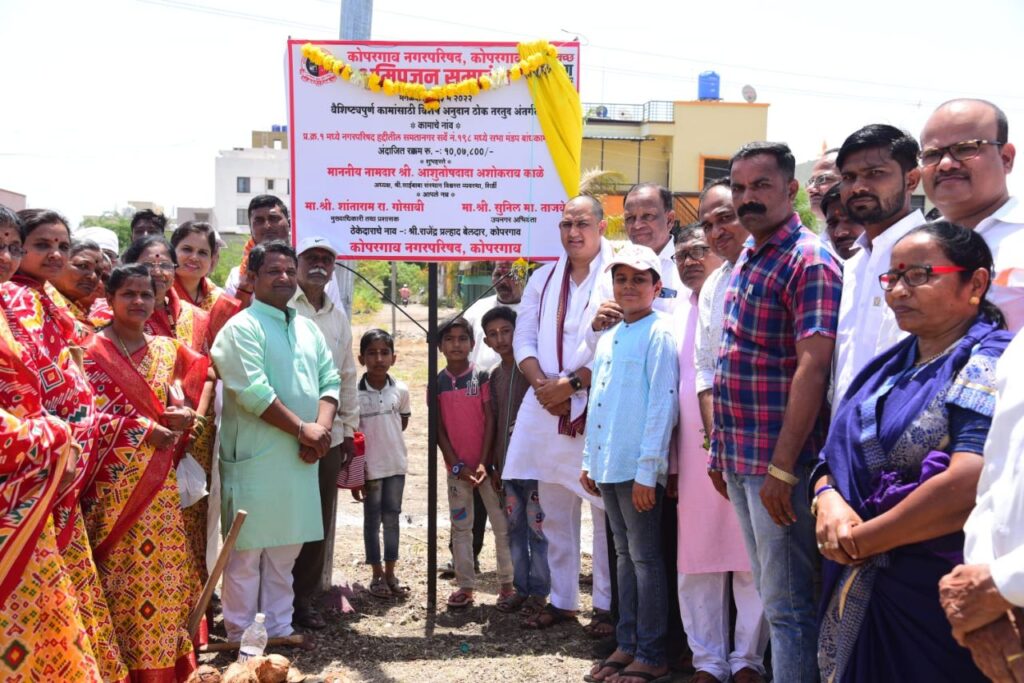 फोटो ओळ- समतानगर येथे लिंगायत समाजासाठी बांधण्यात येणाऱ्या सभामंडपाचे भूमिपूजन प्रसंगी ना. आशुतोष काळे समवेत काका कोयटे व मान्यवर.